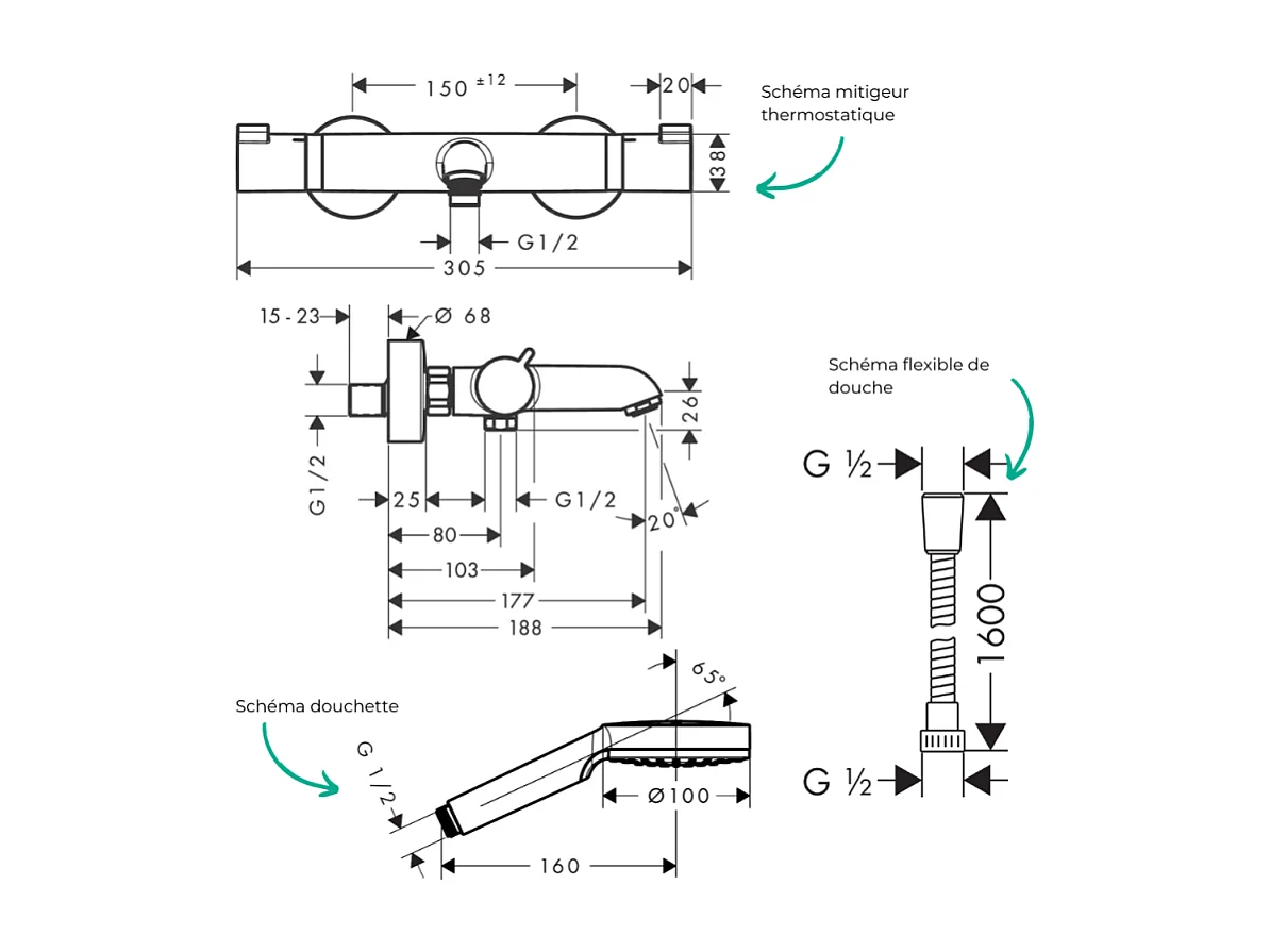 Pack mitigeur bain thermostatique HANSGROHE Ecostat Comfort + Flexible Metaflex 1,6m + Pommeau Vernis Blend EcoSmart chromé