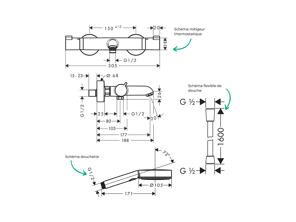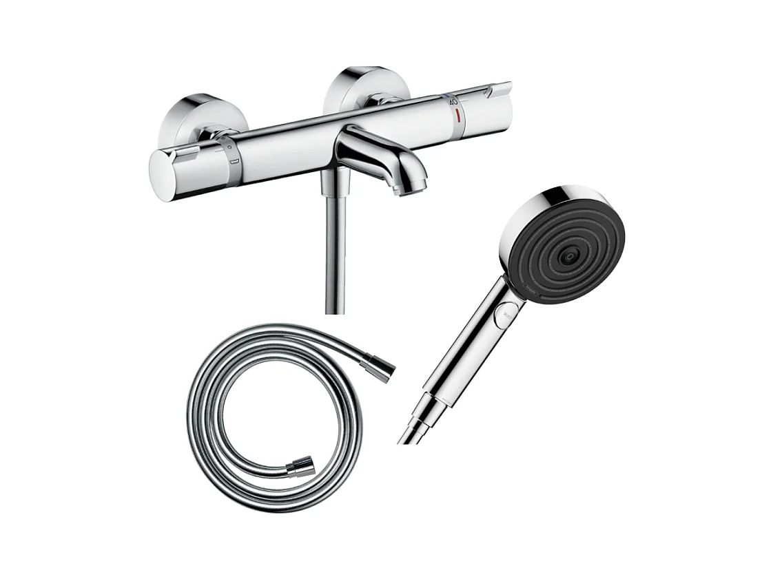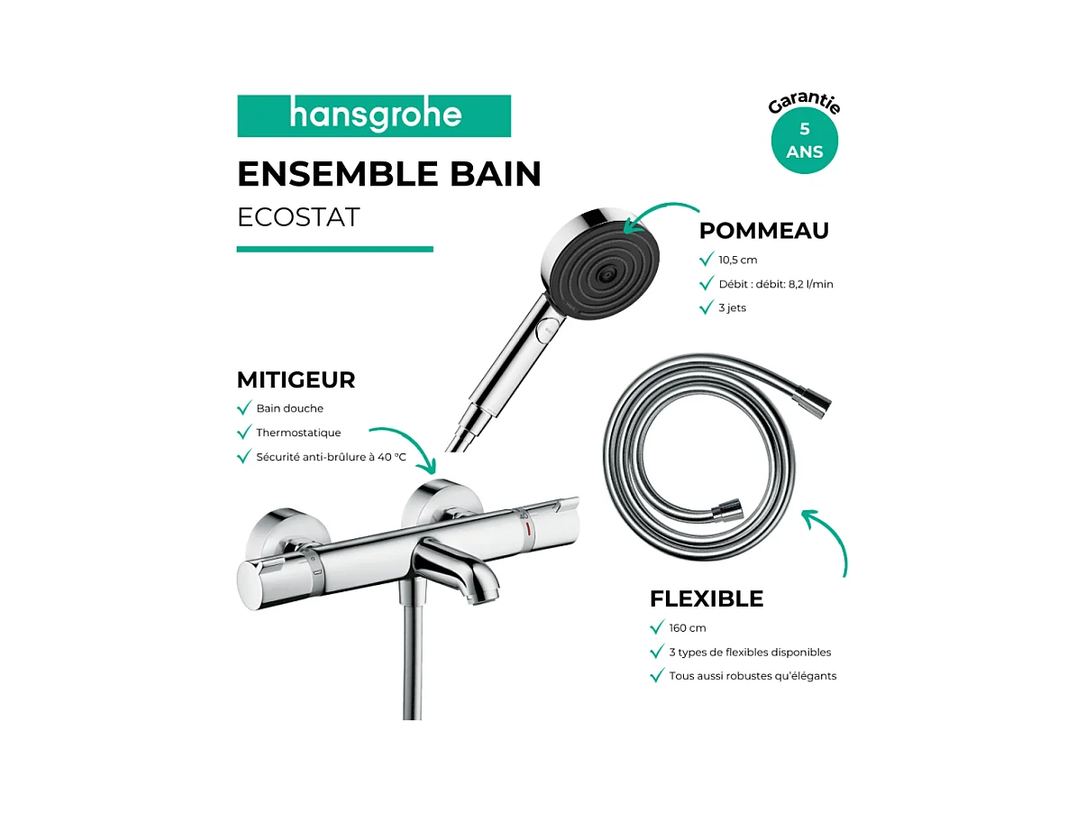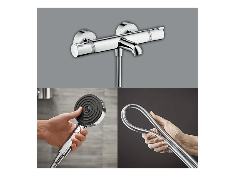 Pack mitigeur bain thermostatique HANSGROHE EcostatComfort + Flexible Isiflex 1,6m + Pommeau Pulsify Select EcoSmart 3 jets chromé