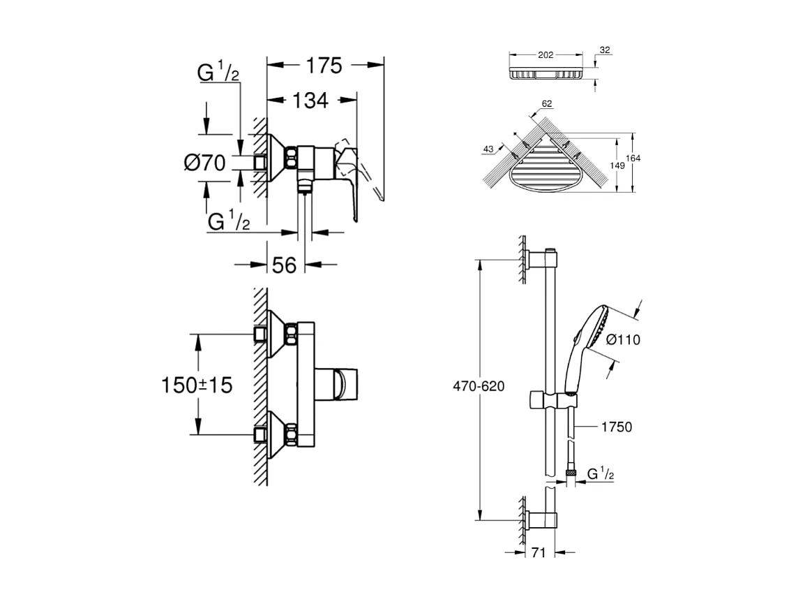 Pack mitigeur douche mécanique GROHE StartLoop + Ensemble de douche 2 jets avec barre + Panier porte-savon