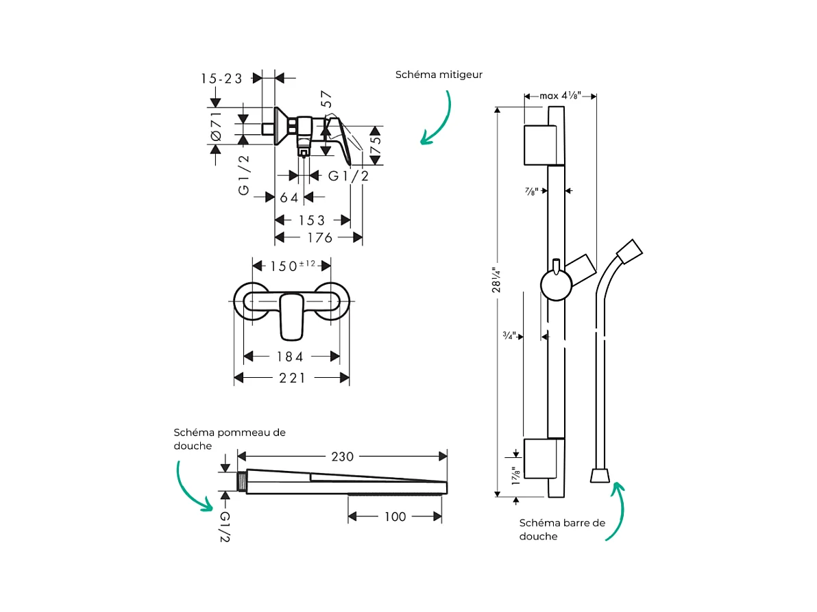 Pack mitigeur douche mécanique HANSGROHE Logis + Barre Unica S Puro + flexible + Pommeau Pulsify E chromé