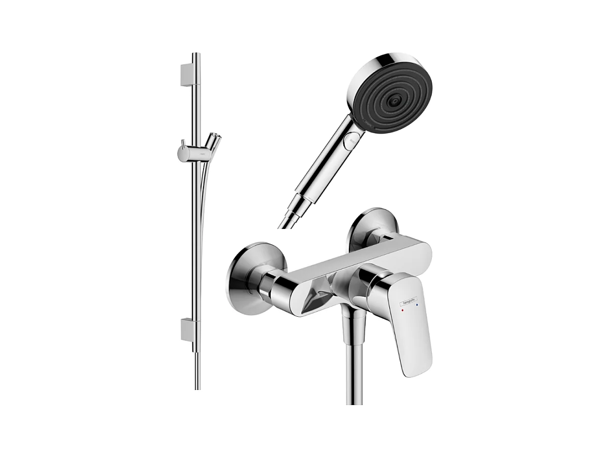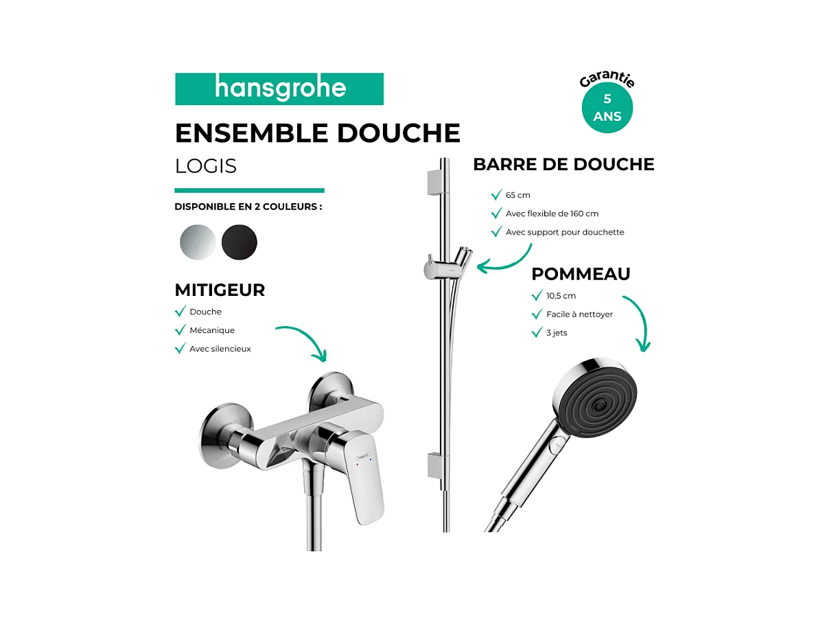 Pack mitigeur douche mécanique HANSGROHE Logis + Barre Unica S Puro + flexible + Pommeau Pulsify Select 3 jets chromé