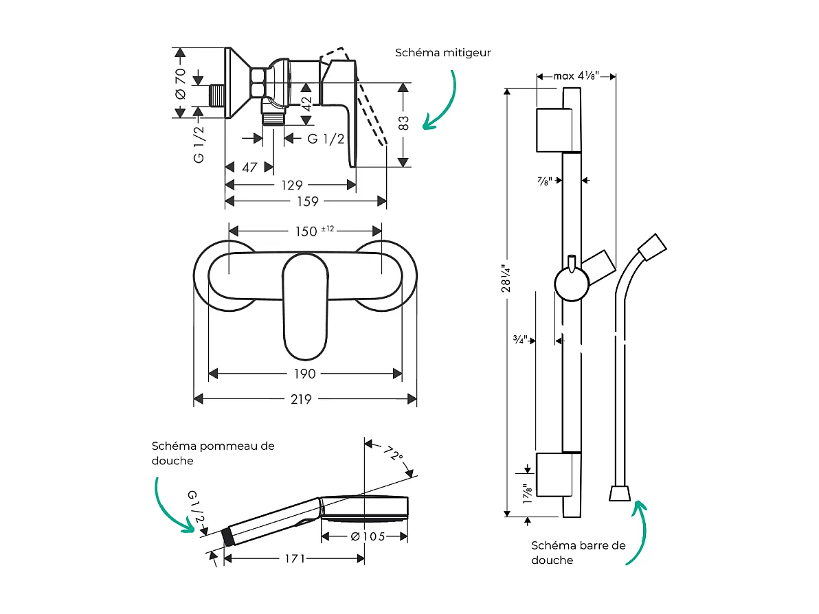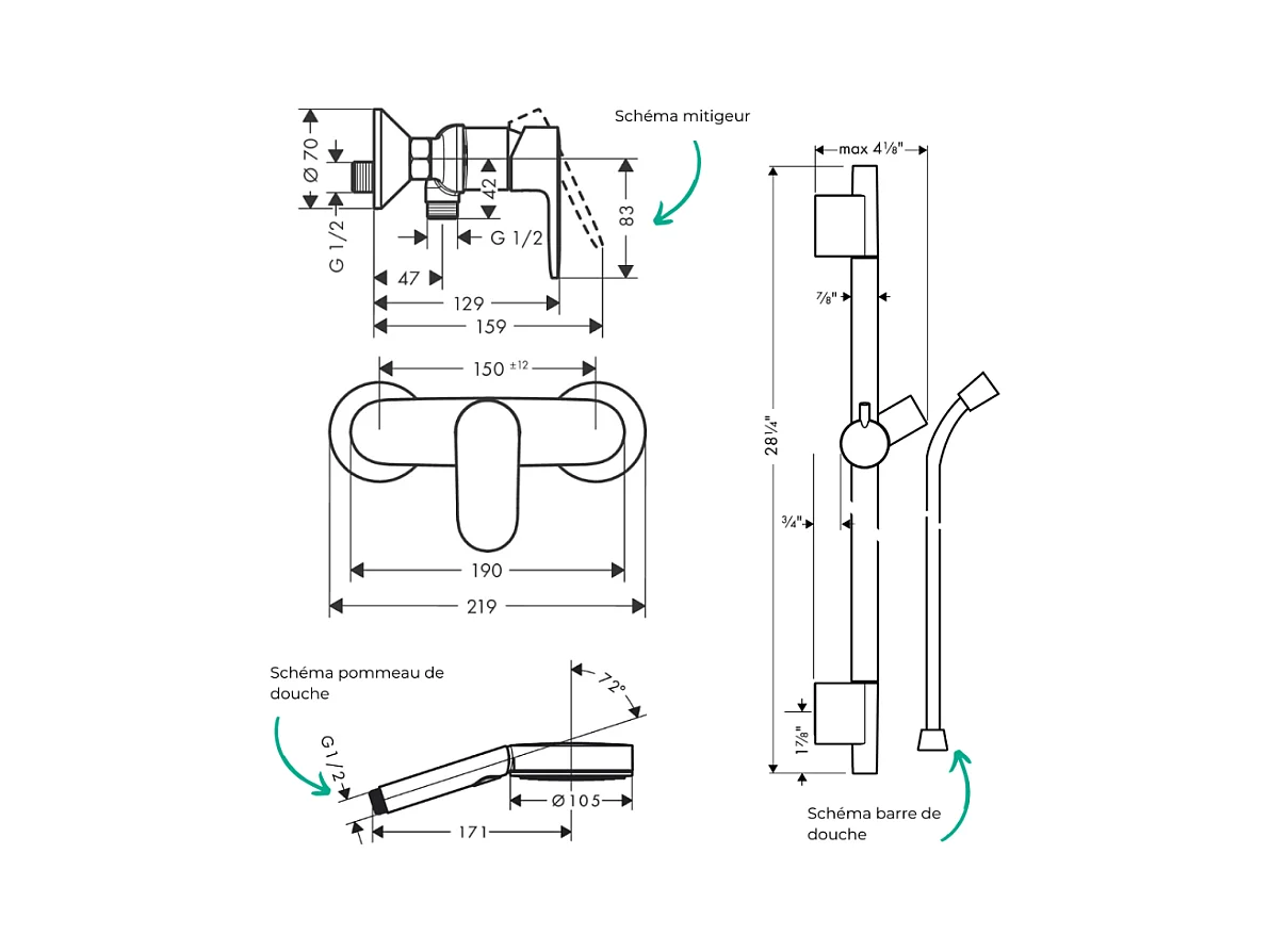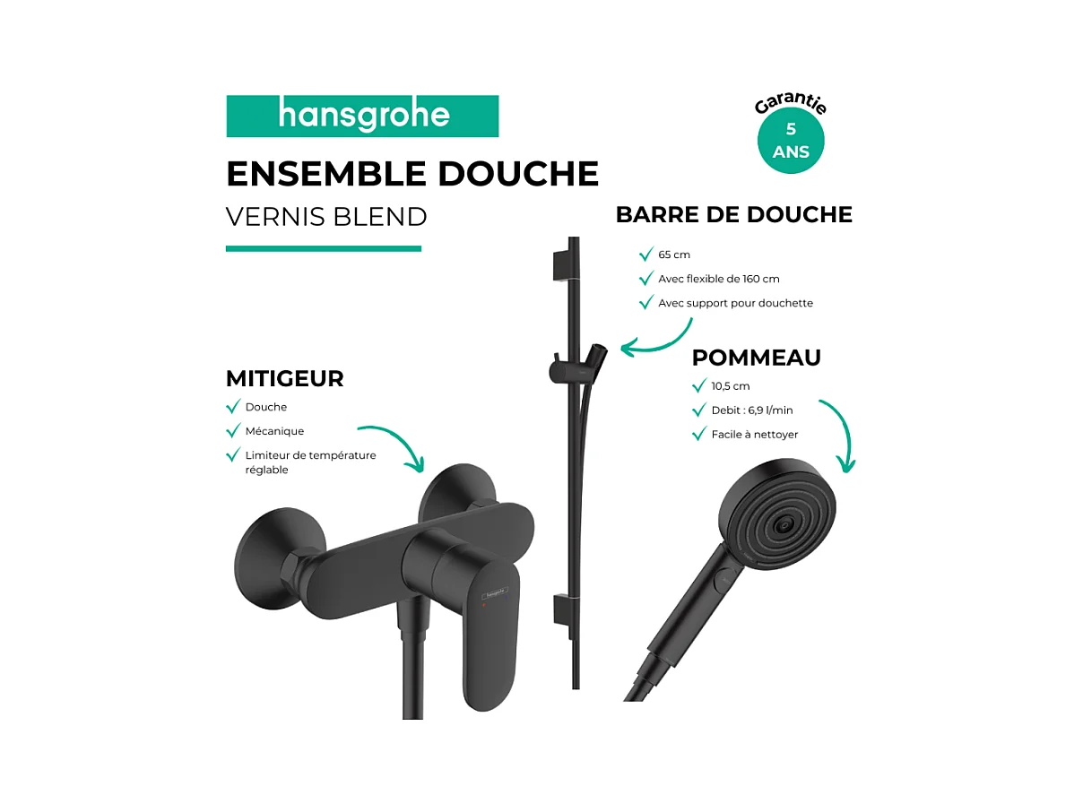 Pack mitigeur douche mécanique HANSGROHE Vernis Blend + Barre Unica S Puro + flexible + Pommeau Pulsify Select 3 jets noir mat