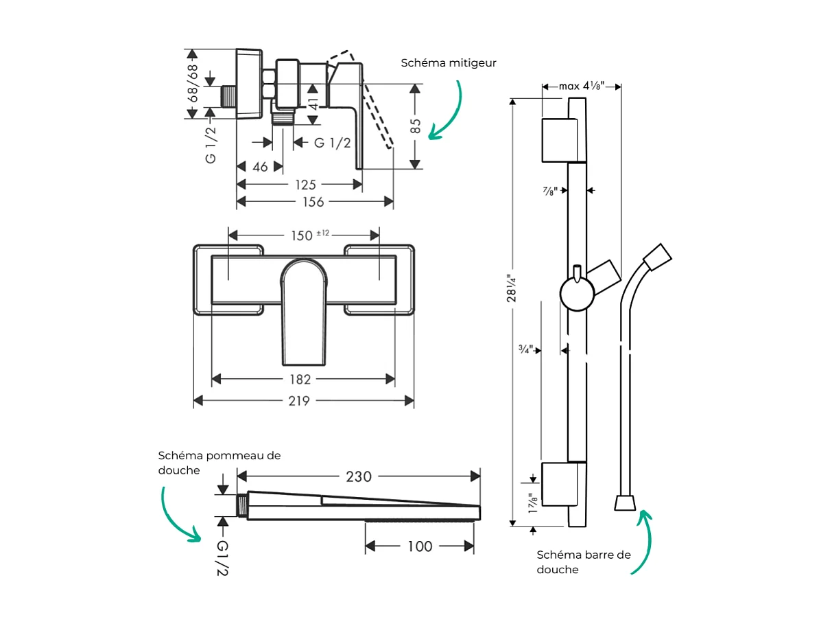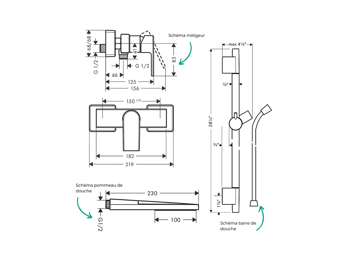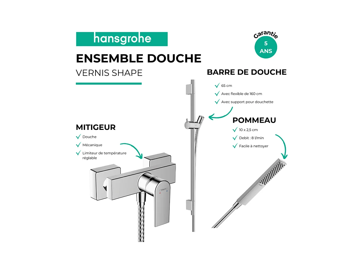 Pack mitigeur douche mécanique HANSGROHE Vernis Shape + Barre Unica S Puro + flexible + Pommeau Pulsify E chromé