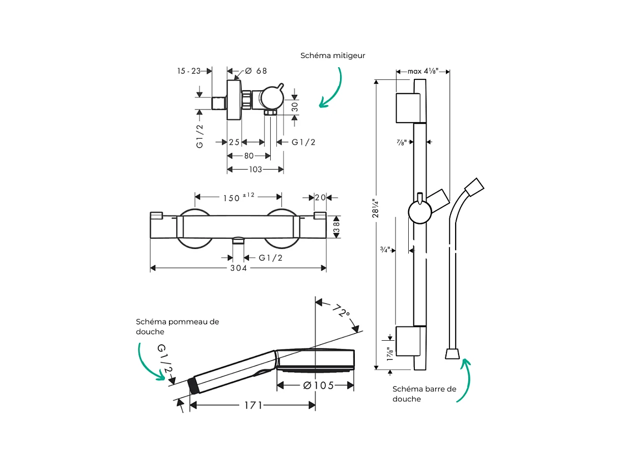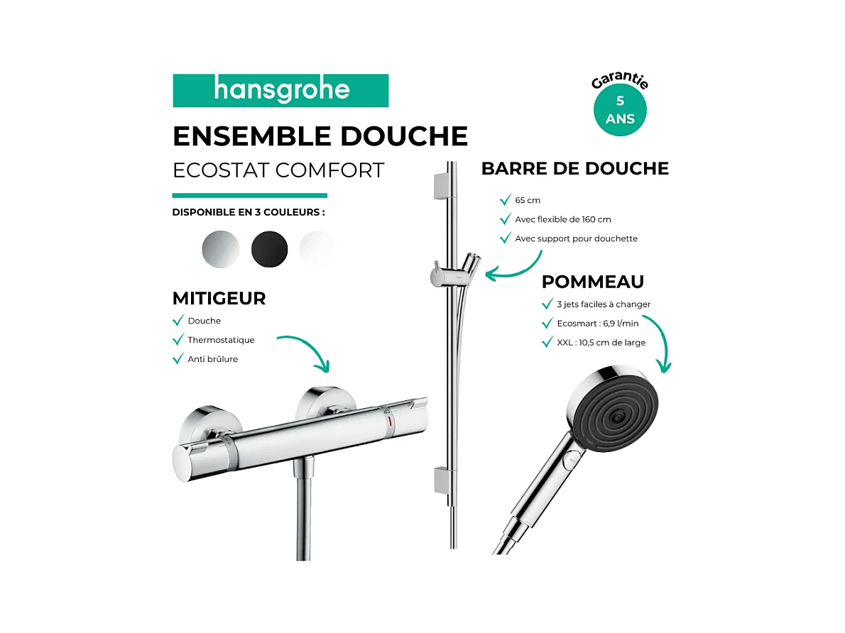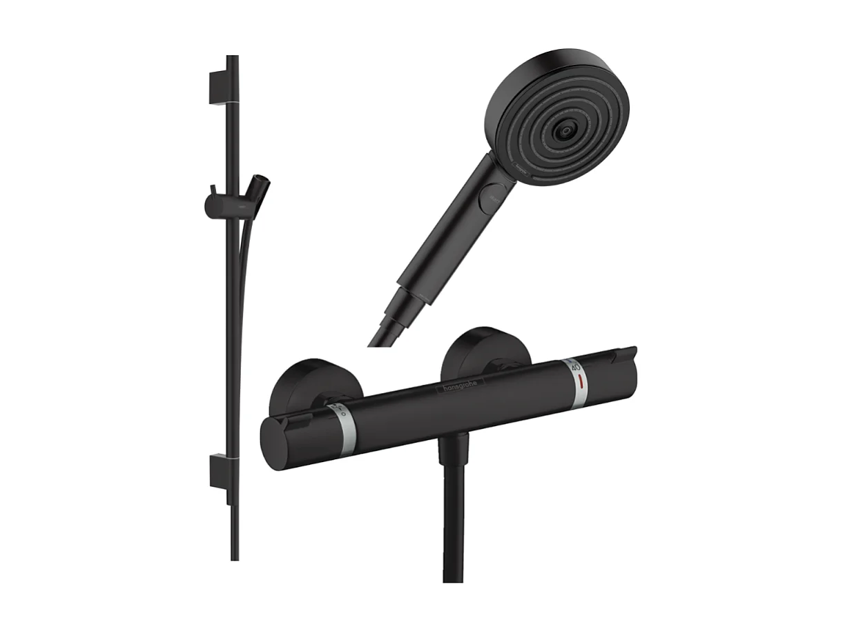 Pack mitigeur douche thermostatique HANSGROHE Ecostat Comfort + Barre Unica + flexible + Pommeau Pulsify Select 3 jets noir mat