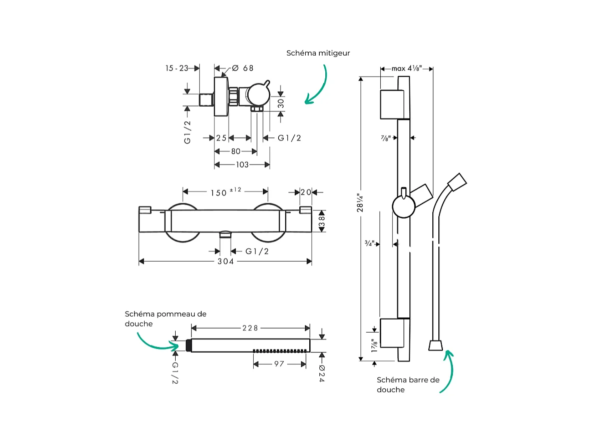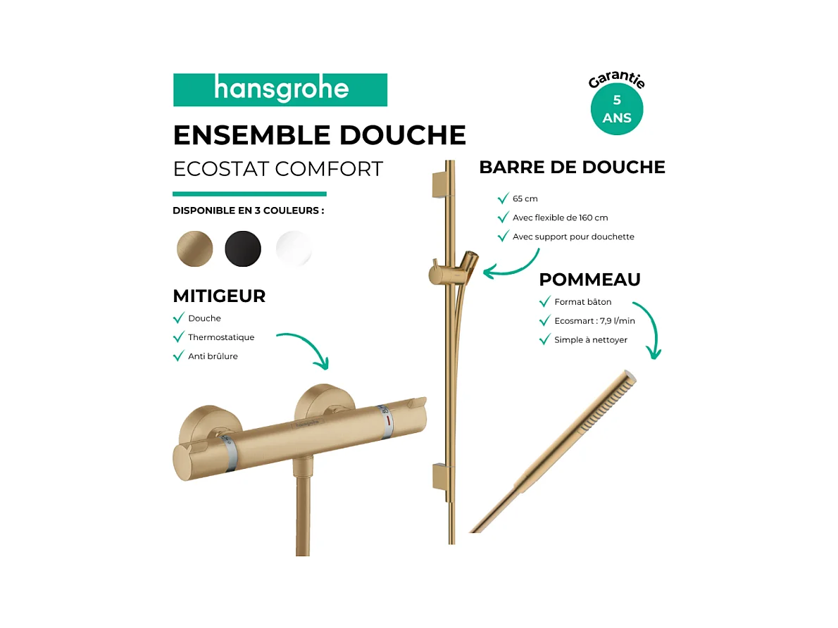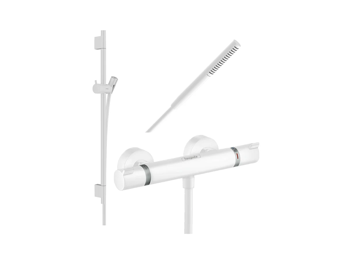Pack mitigeur douche thermostatique HANSGROHE Ecostat Comfort + Barre Unica S Puro + flexible + Pommeau Pulsify S blanc mat