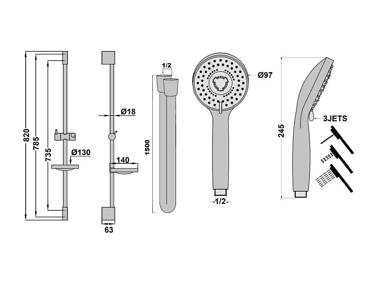Pack pommeau de douche rond 3 jets + flexible + barre + porte savon Paini Ruby Chrome