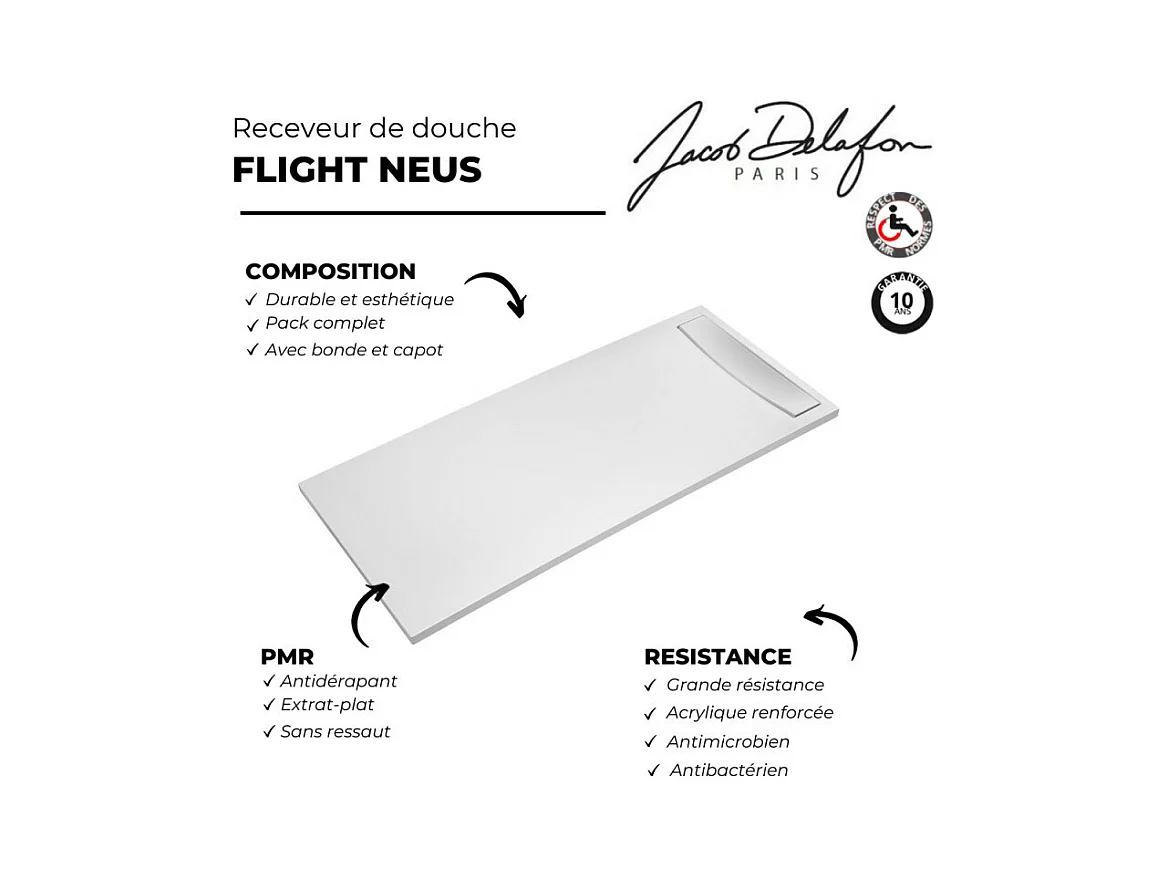 Pack receveur de douche antidérapant 100 x 80 JACOB DELAFON Flight Neus rectangle blanc+Kit d'étanchéité WEDI + Bonde + Capot
