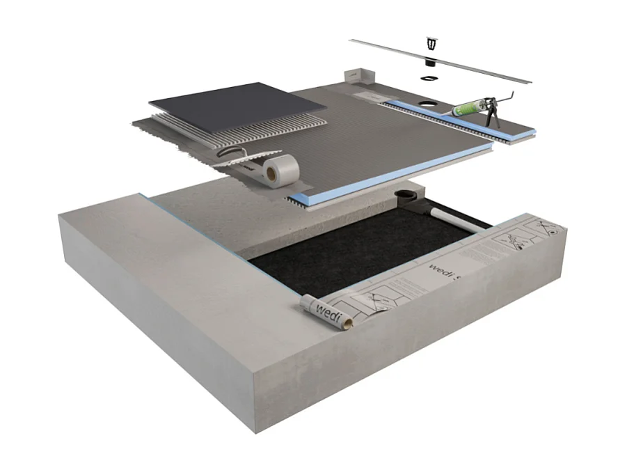 Pack receveur de douche pré-penté 104 x 120 x 3,8 cm WEDI Fundo Flex béton + bonde horizontale + écoulement linéaire + support