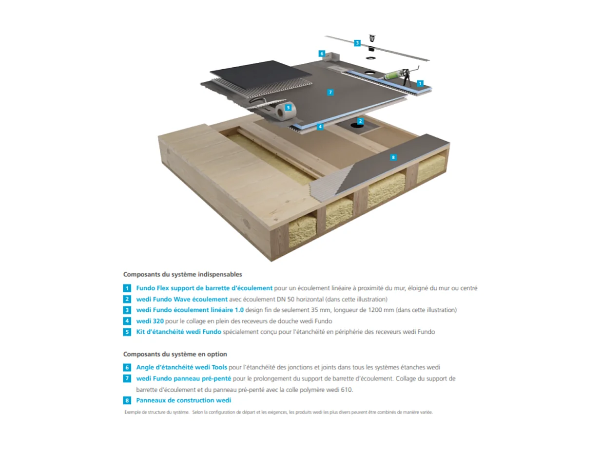Pack receveur de douche pré-penté 164 x 120 x 3,5 cm WEDI Fundo Flex bois + bonde horizontale + écoulement linéaire + support