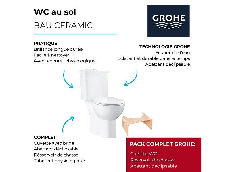 PACK WC à poser GROHE Bau Ceramic + Tabouret physiologique Bois