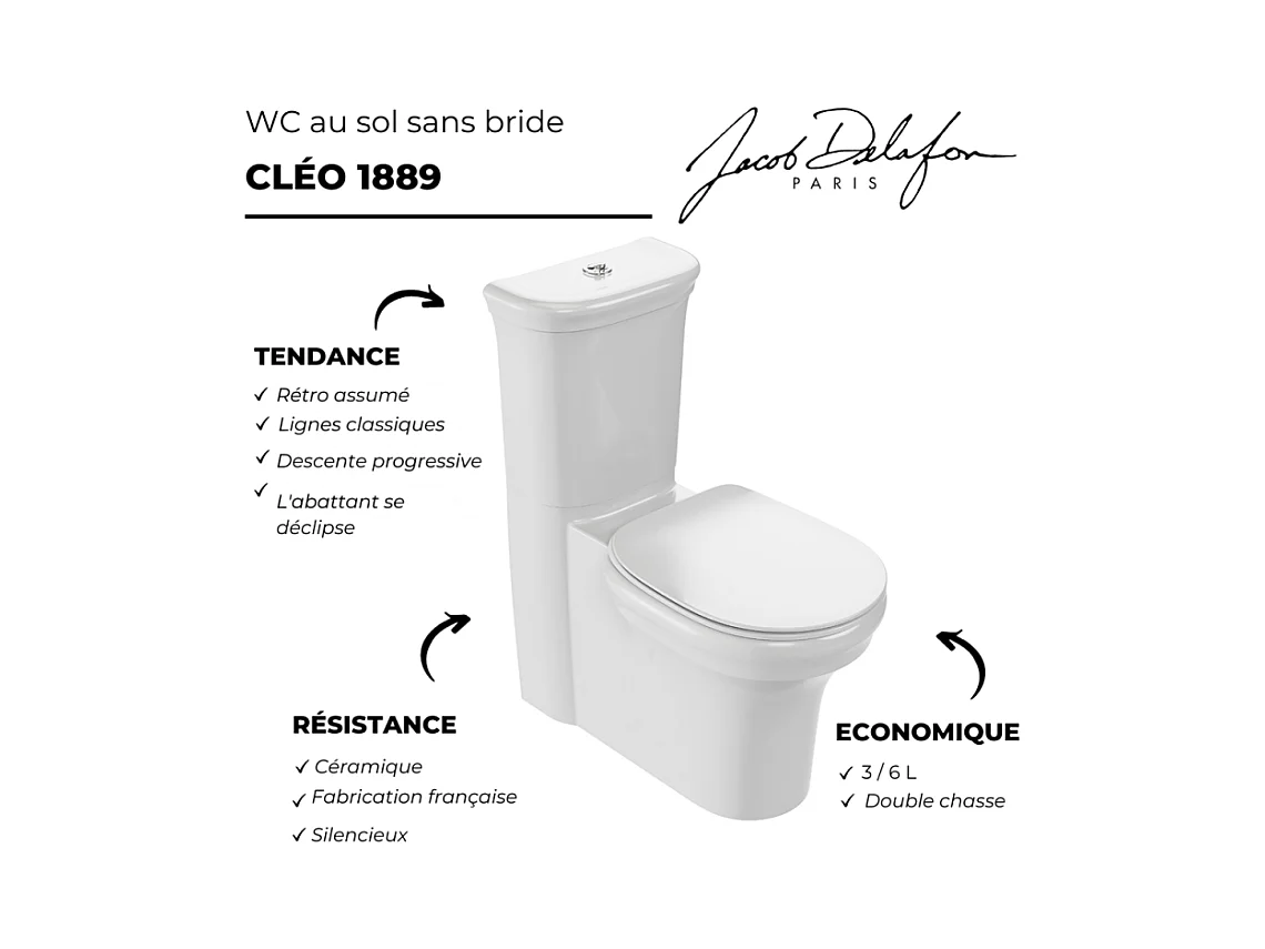 Pack WC au sol sans bride JACOB DELAFON Cléo 1889 + réservoir + abattant