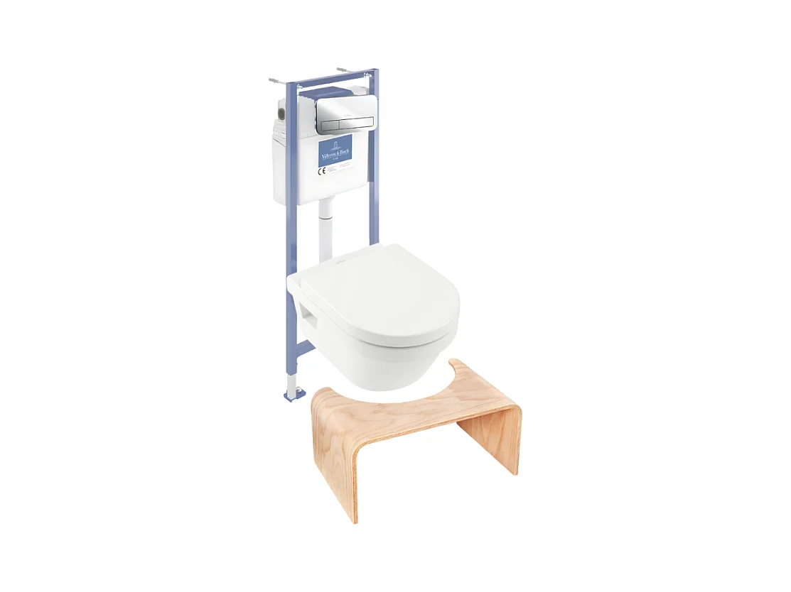 Pack WC sans bride VILLEROY ET BOCH Architectura abattant + bâti-support sol et mur + plaque chromée brillant + Tabouret bois