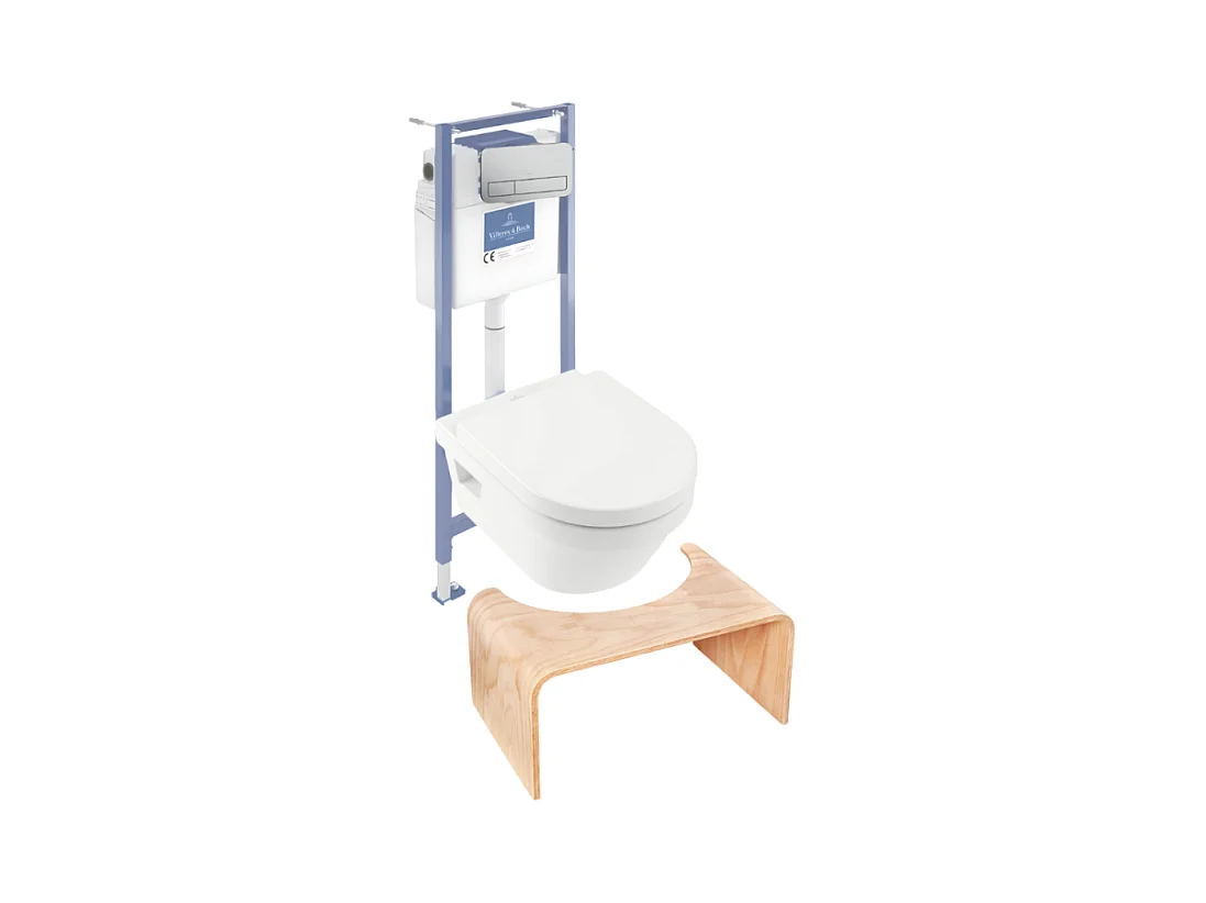 Pack WC sans bride VILLEROY ET BOCH Architectura abattant + bâti-support sol et mur + plaque chromée mat + Tabouret bois
