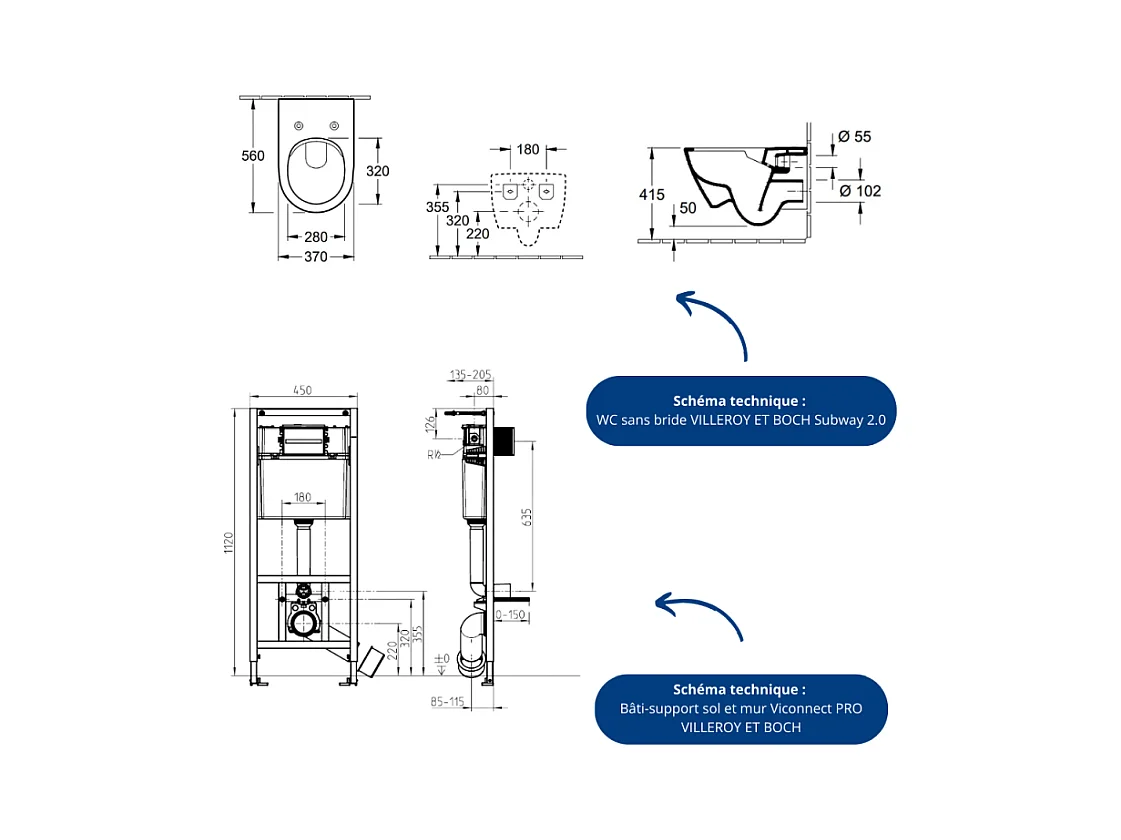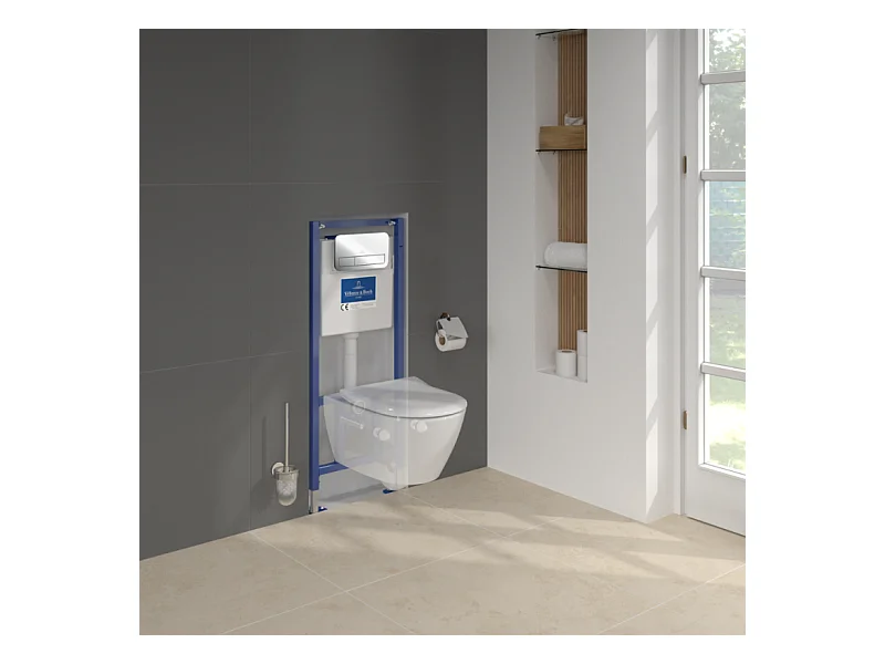 Pack WC sans bride VILLEROY ET BOCH Subway 2.0 abattant frein de chute + bâti-support sol et mur + plaque Chromé + Tabouret