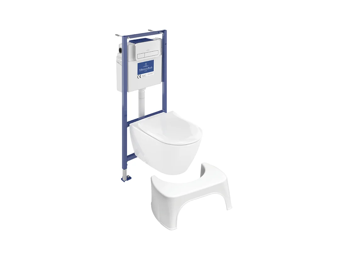 Pack WC sans bride VILLEROY ET BOCH Subway 2.0 abattant frein de chute + bâti-support sol et mur+ plaque blanche + Tabouret blanc