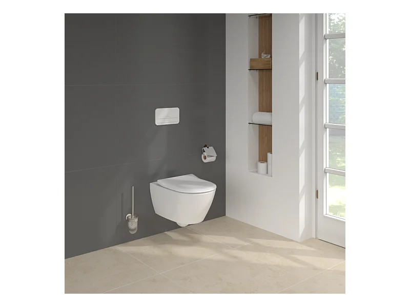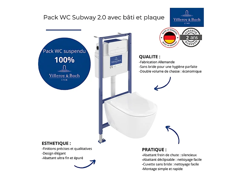 Pack WC sans bride VILLEROY ET BOCH Subway 2.0 avec abattant frein de chute + bâti Viconnect PRO + plaque blanche + Tabouret bois