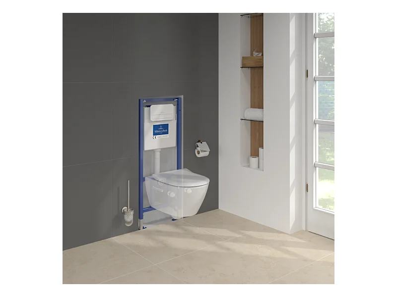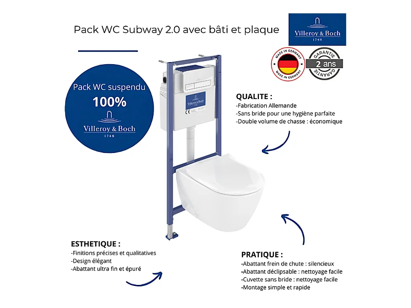 Pack WC sans bride VILLEROY ET BOCH Subway 2.0 abattant frein de chute + bâti-support sol et mur+ plaque Chromé mat +Tabouret bois