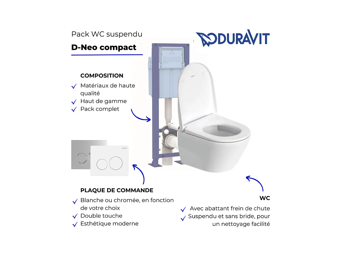 Pack WC suspendu compact sans bride DURAVIT D-Neo avec abattant frein de chute + bati support SIAMP + Plaque de commande blanche
