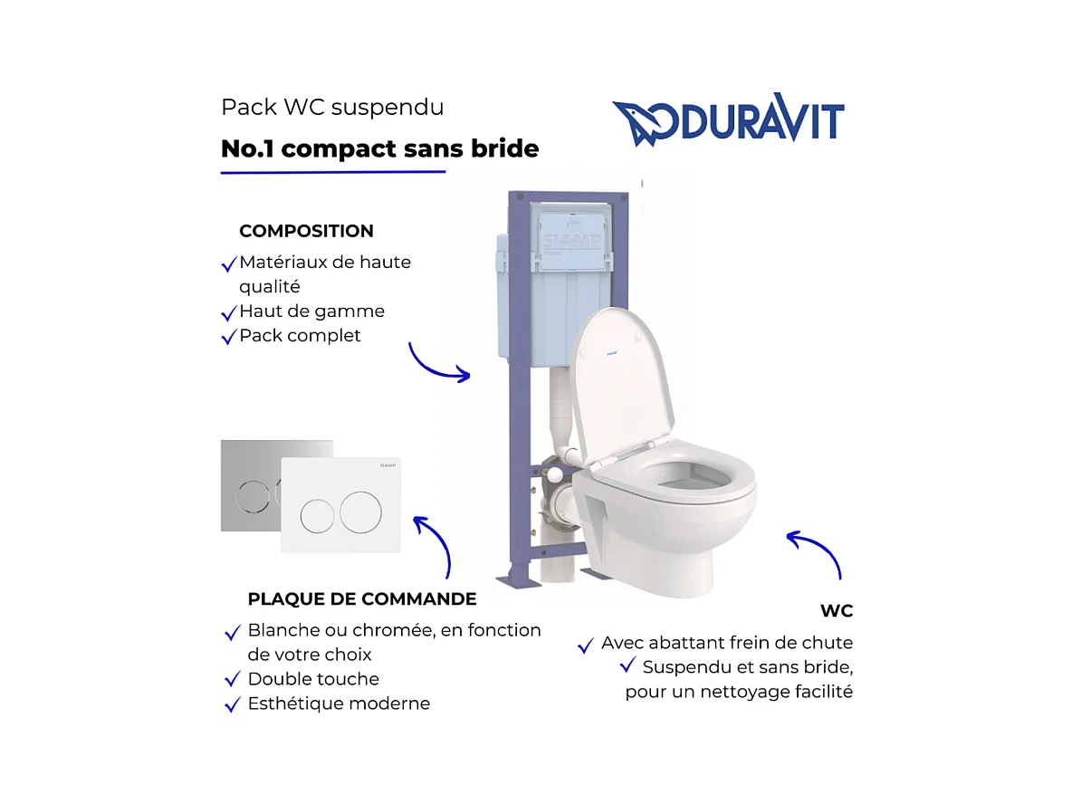 Pack WC suspendu compact sans bride DURAVIT Duravit No.1 abattant frein de chute + bati support SIAMP + Plaque blanche + tabouret