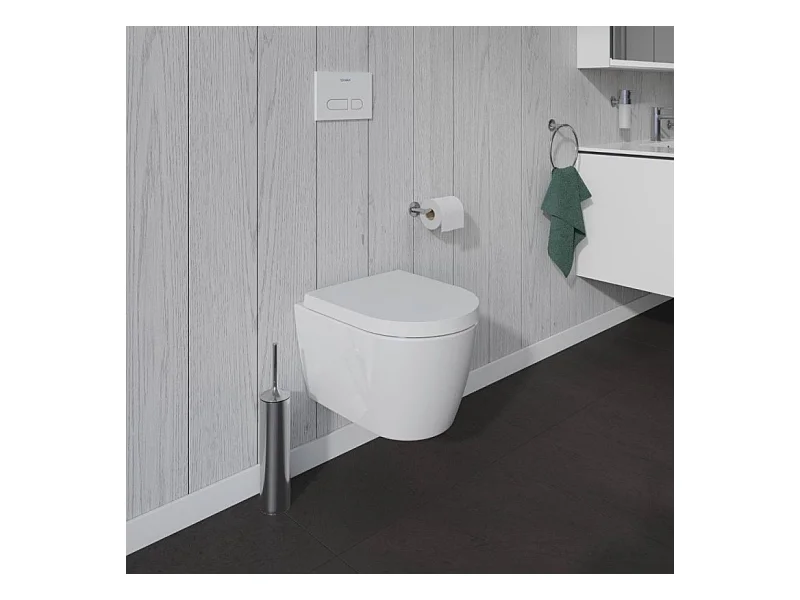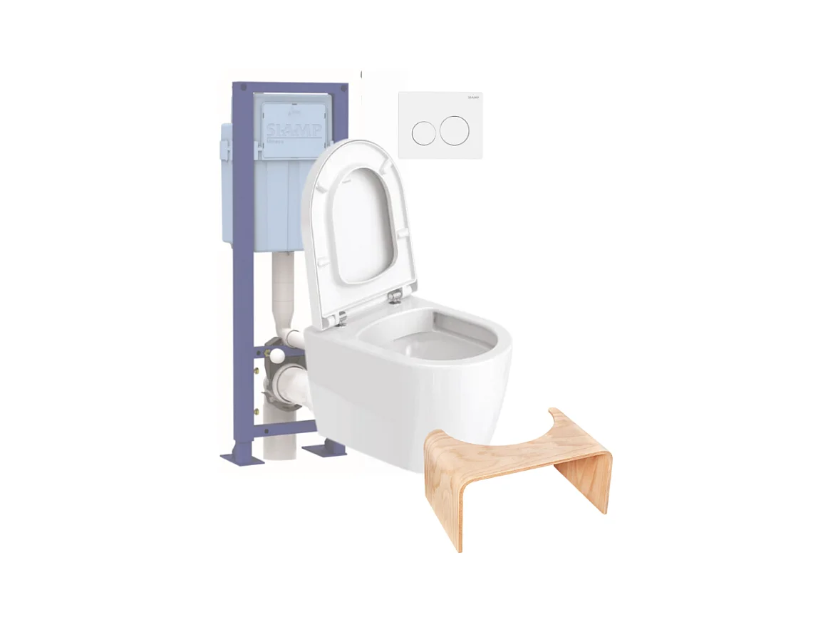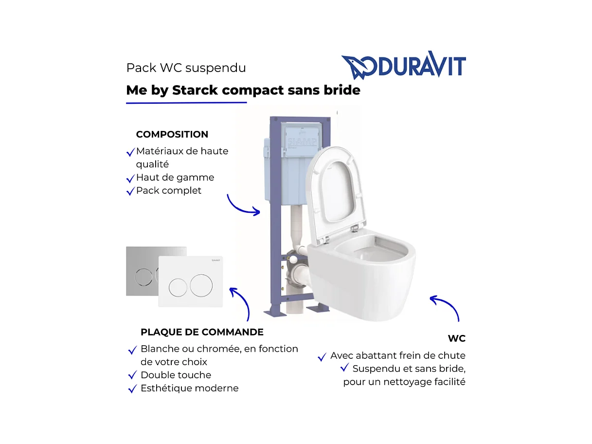 Pack WC suspendu compact sans bride DURAVIT Me by Starck abattant + bati support SIAMP + Plaque blanche + tabouret bois