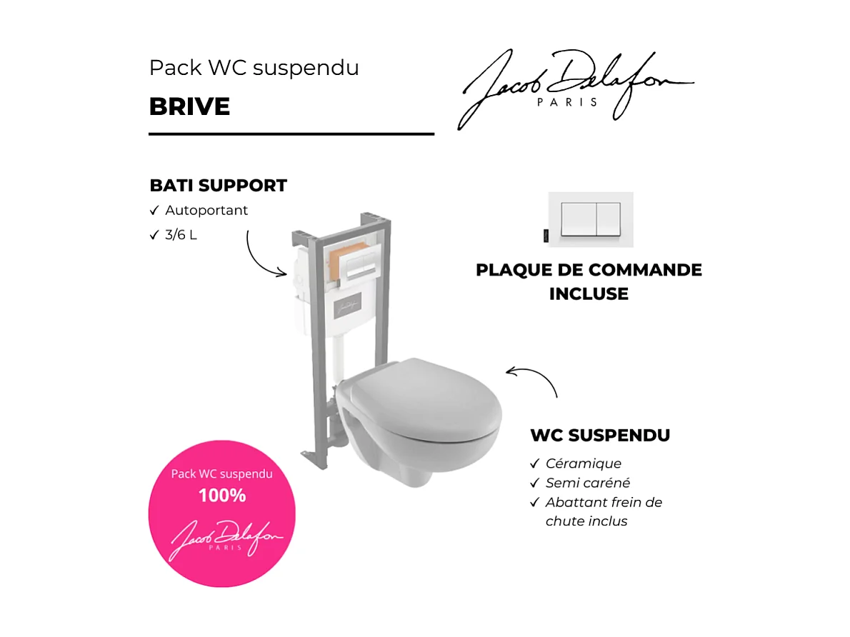 Pack WC suspendu JACOB DELAFON Brive semi caréné + bâti-support + abattant frein de chute + plaque blanche