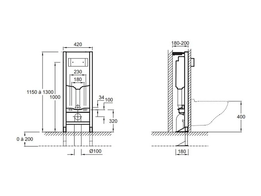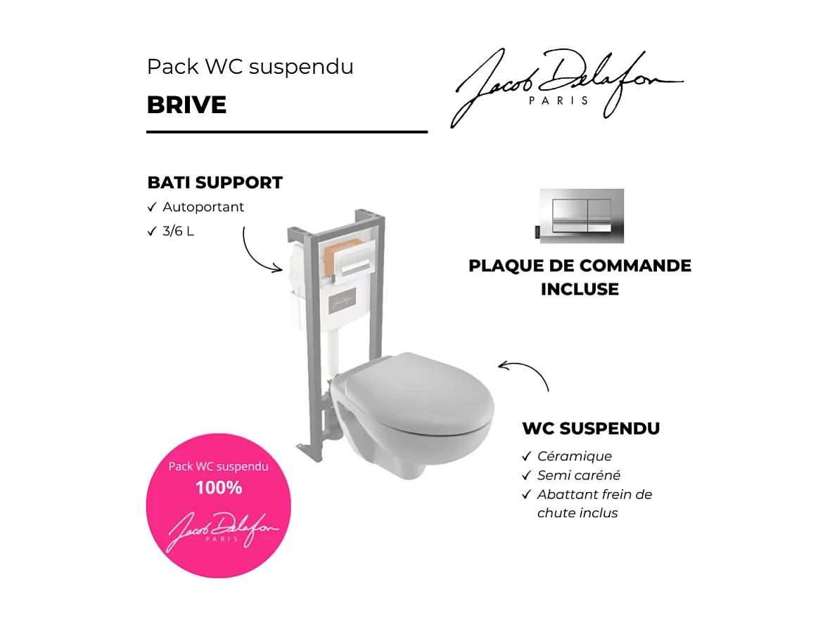 Pack WC suspendu JACOB DELAFON Brive semi caréné + bâti-support + abattant frein de chute + plaque chromée