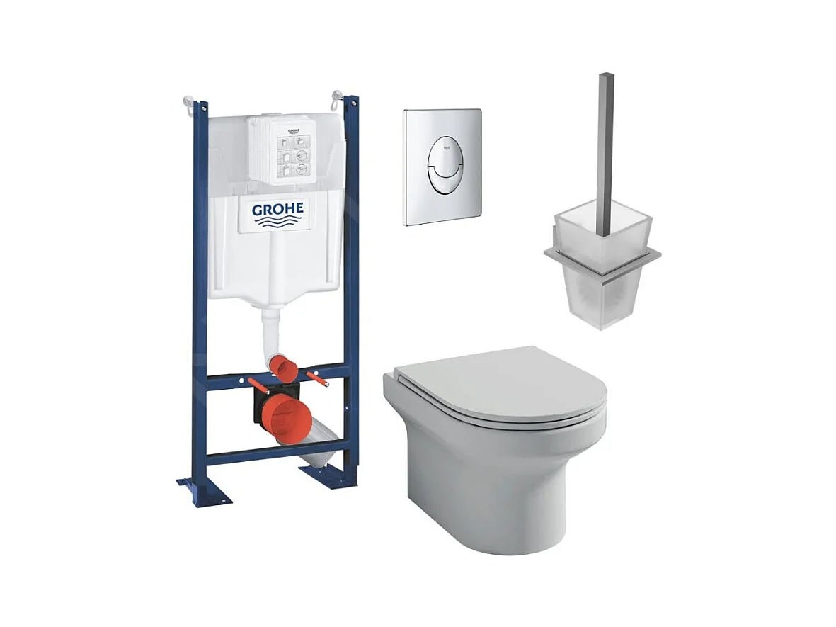 Pack WC suspendu sans bride Jacob Delafon Elite abattant + Bâti support Grohe RapidSL + plaque chromé + Porte-balai carré
