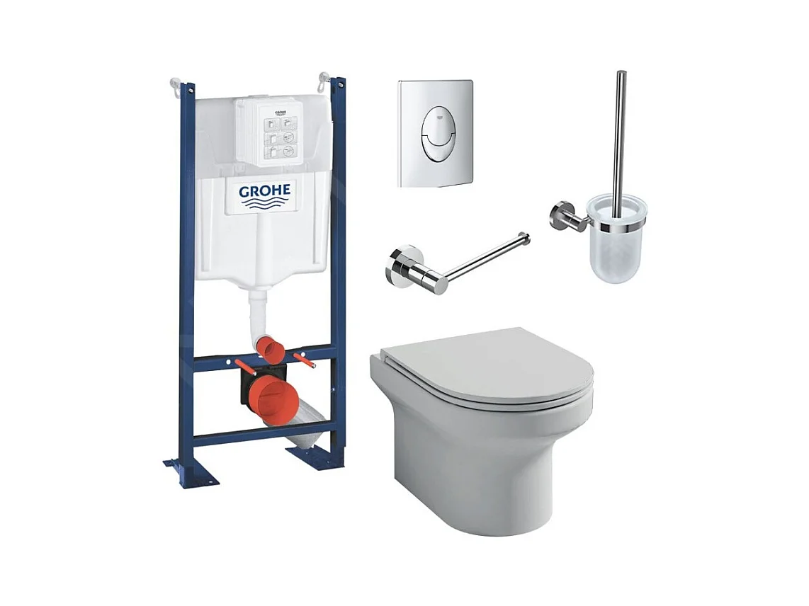 Pack WC suspendu sans bride JACOB DELAFON Elite + Bâti support GROHE Rapid SL + plaque chromé + Porte-balai + Porte-rouleau