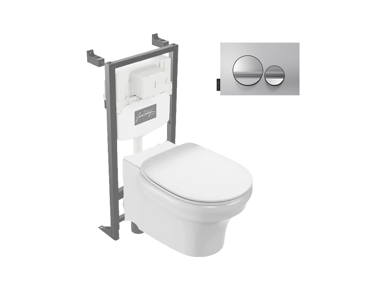 Pack WC suspendu sans bride à économie d'eau JACOB DELAFON Cléo 1889 + abattant + bâti-support + plaque ronde chromé