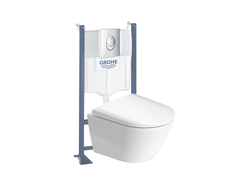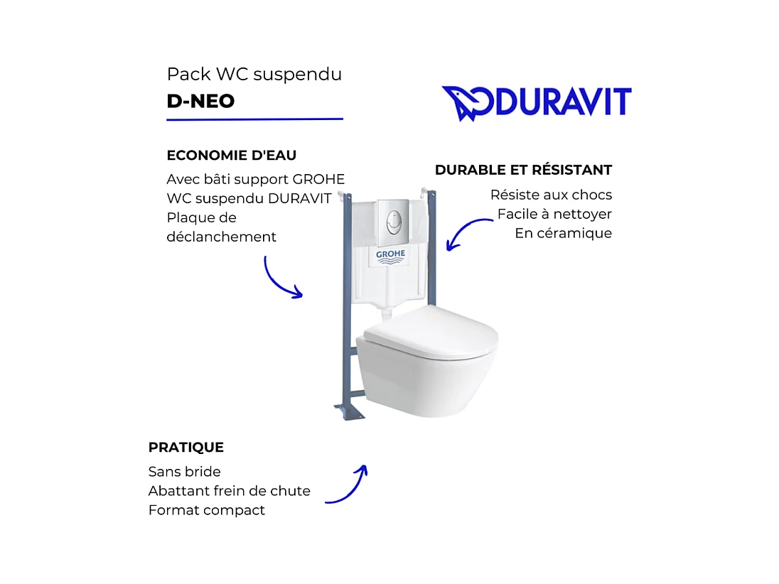 Pack WC suspendu sans bride compact DURAVIT D-Neo + bâti support GROHE Rapid SL Projet + abattant + plaque chromé