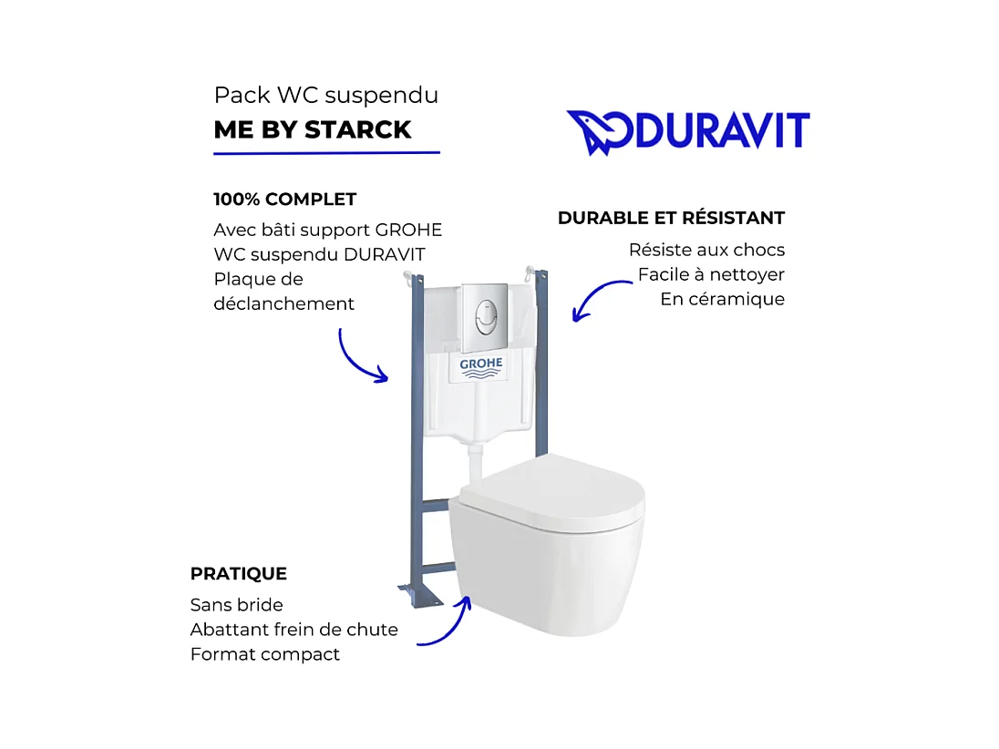 Pack WC suspendu sans bride compact DURAVIT Me by Starck + bâti support GROHE Rapid SL Projet + abattant + plaque chromé