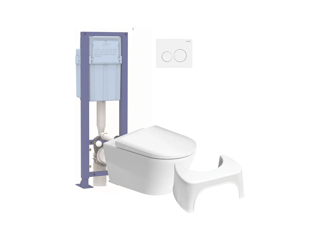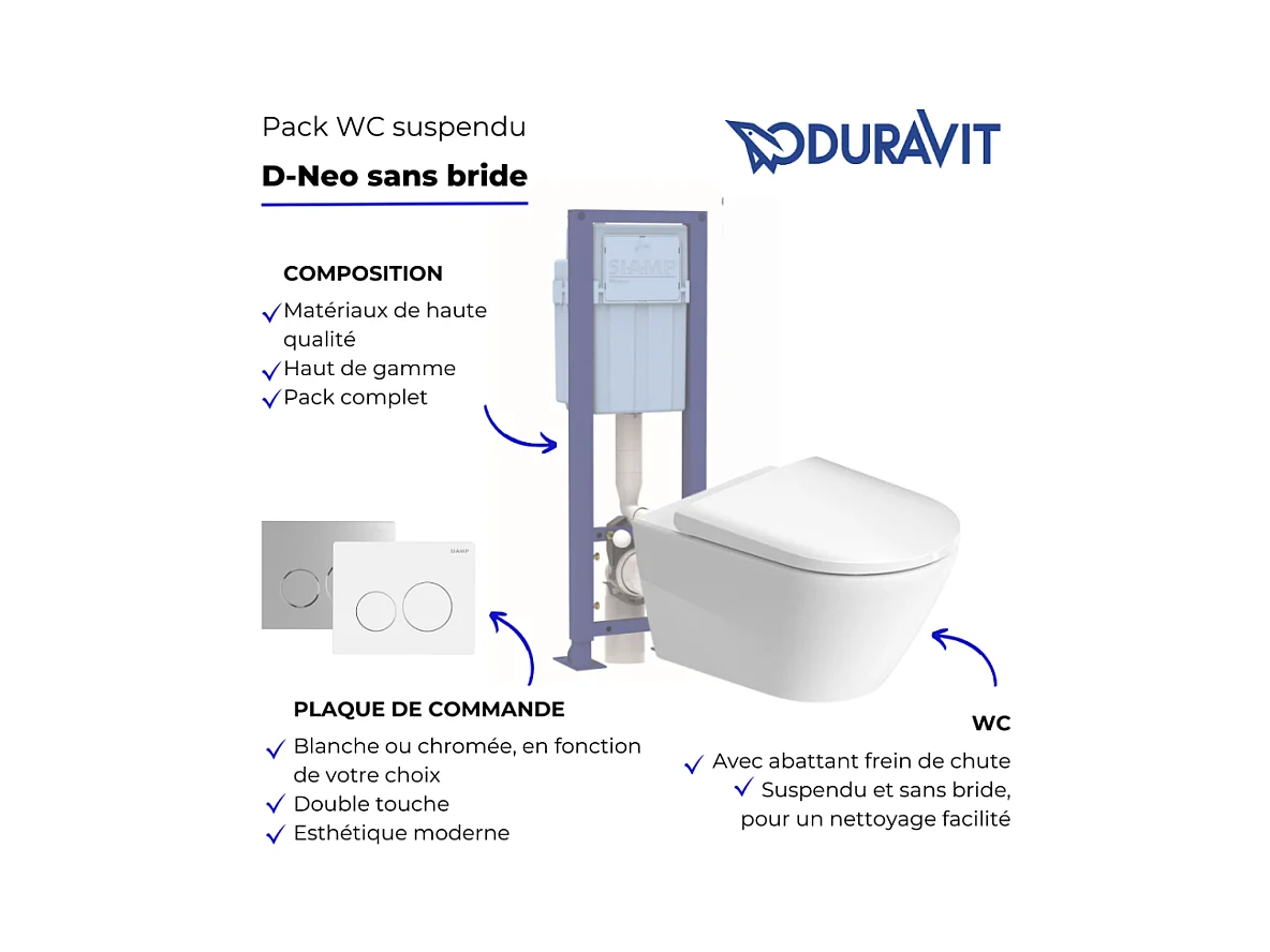 Pack WC suspendu sans bride DURAVIT D-Neo avec abattant frein de chute + bati support SIAMP + Plaque chromée + Tabouret