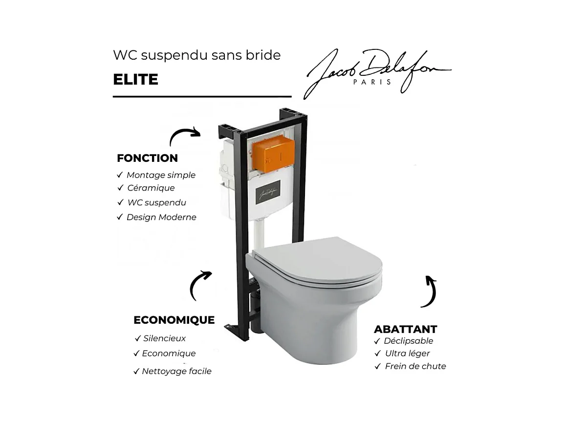 Pack WC suspendu sans bride JACOB DELAFON Elite + bâti-support + plaque Chrome + accessoires