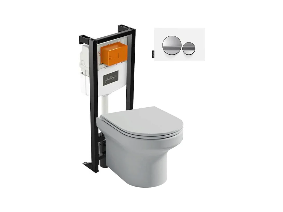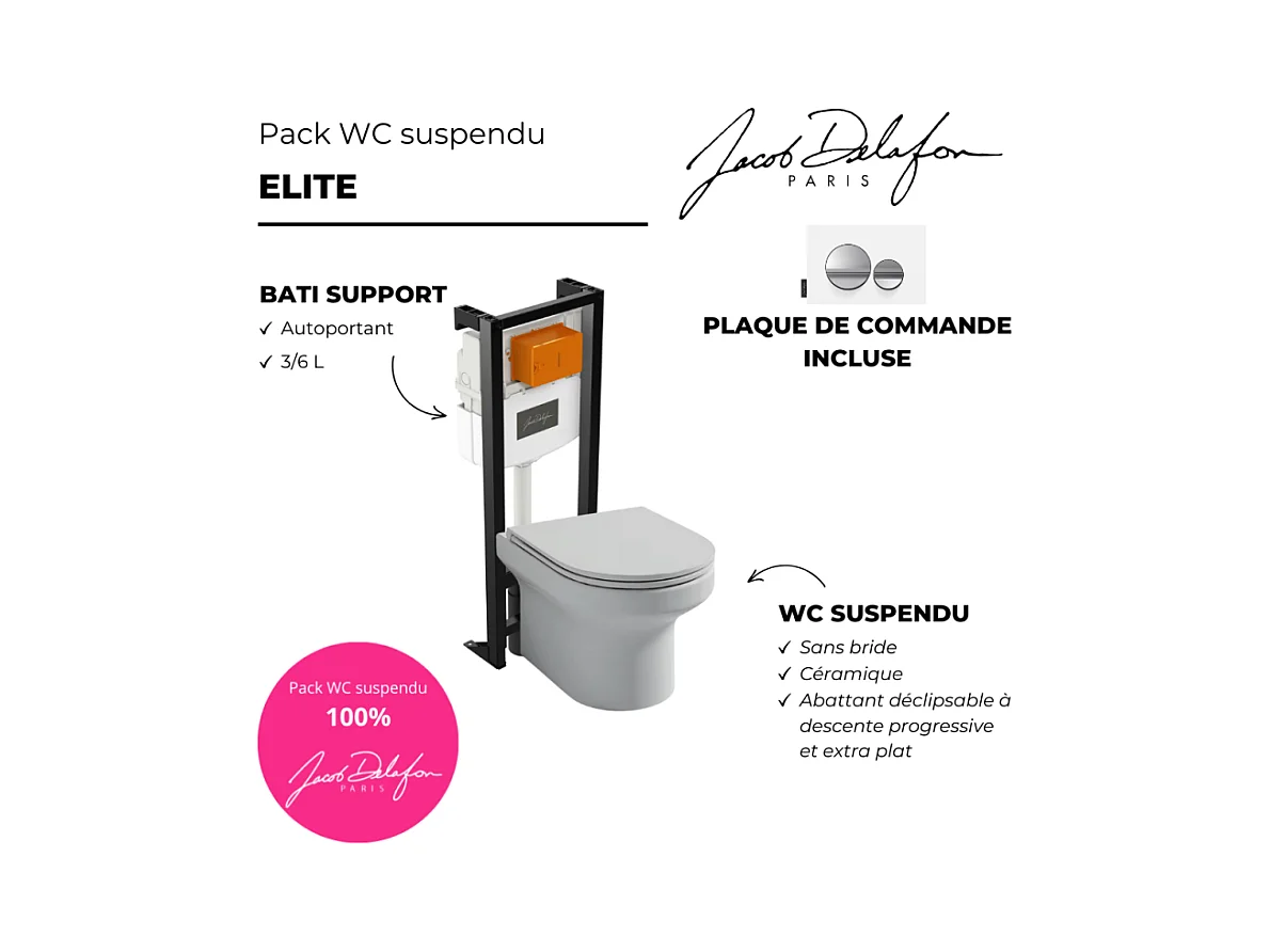 Pack WC suspendu sans bride JACOB DELAFON Elite + bâti-support + plaque Chrome brillant/Blanc mat