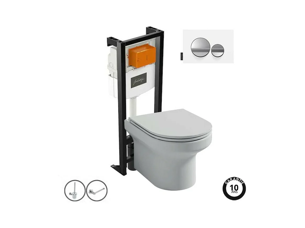Pack WC suspendu sans bride JACOB DELAFON Elite + bâti-support + plaque Chrome brillant/Blanc mat + accessoires