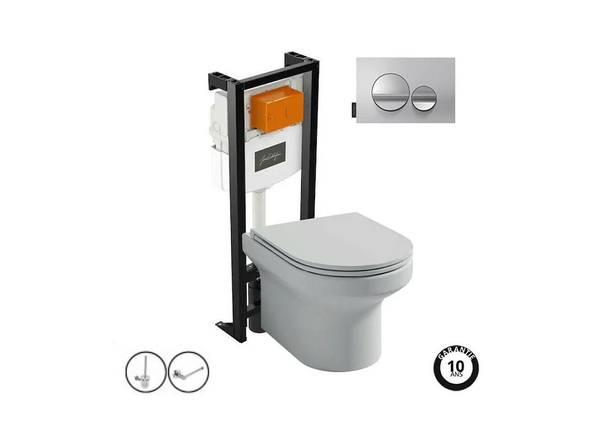 Pack WC suspendu sans bride JACOB DELAFON Elite + bâti-support + plaque Chrome brillant/Chrome mat + accessoires