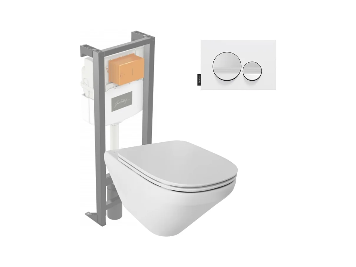 Pack WC suspendu sans bride JACOB DELAFON Modern Life + abattant + bâti-support + plaque ronde blanche