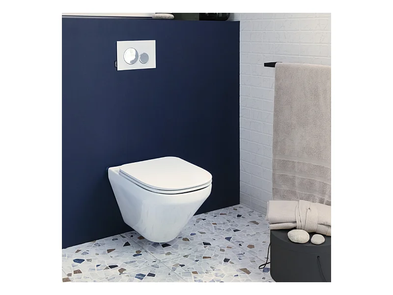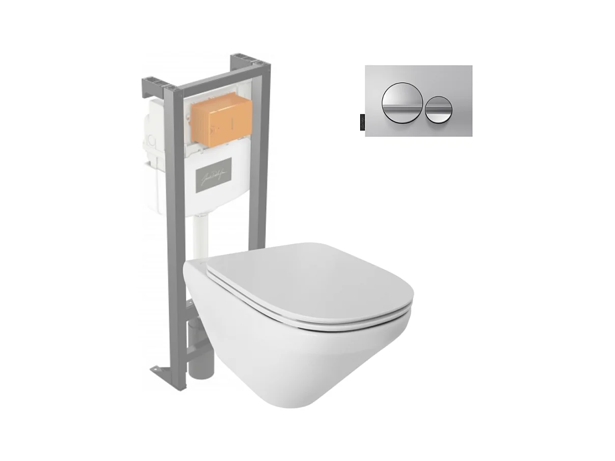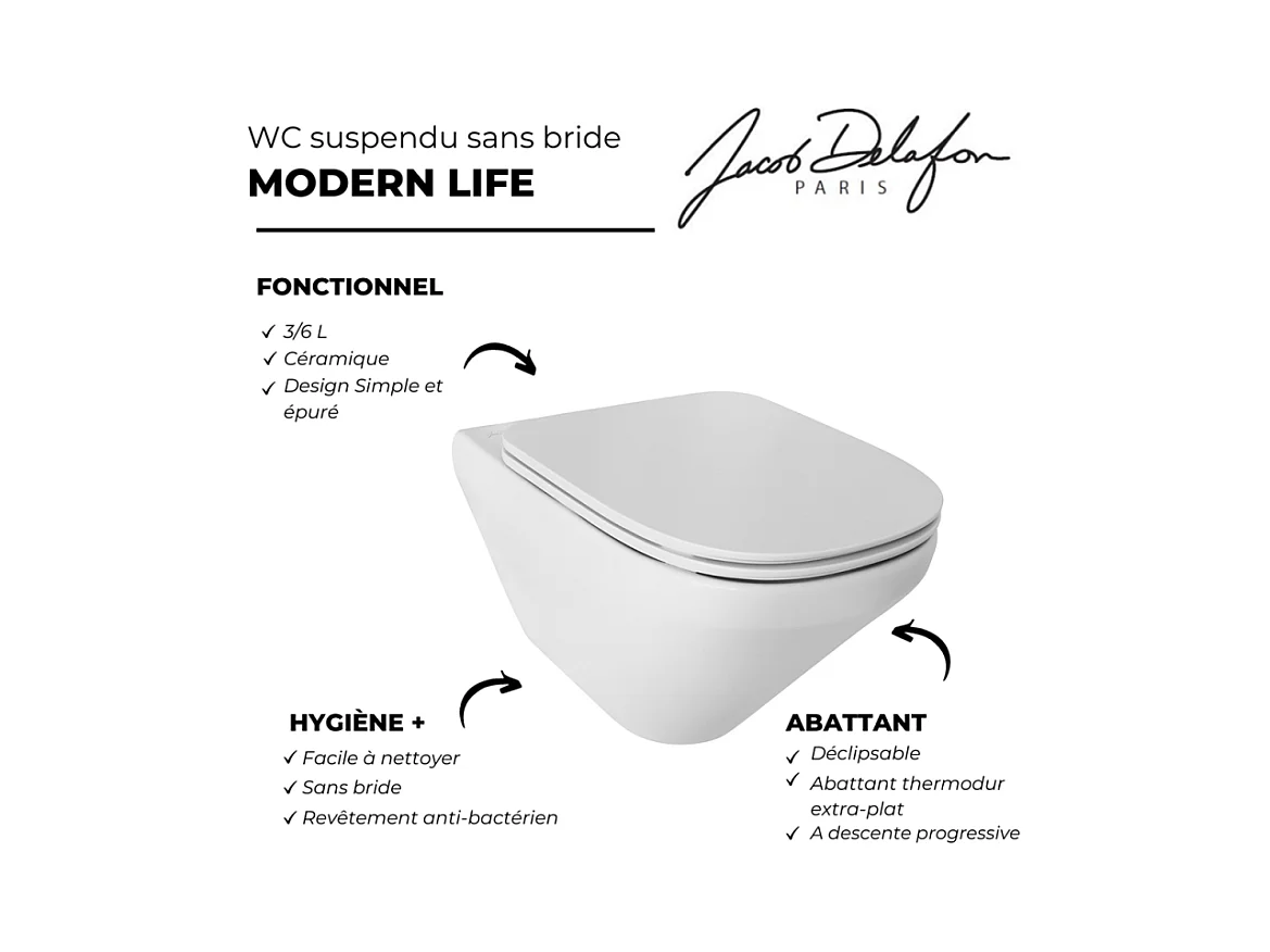 Pack WC suspendu sans bride JACOB DELAFON Modern Life + abattant + bâti-support + plaque ronde chromé