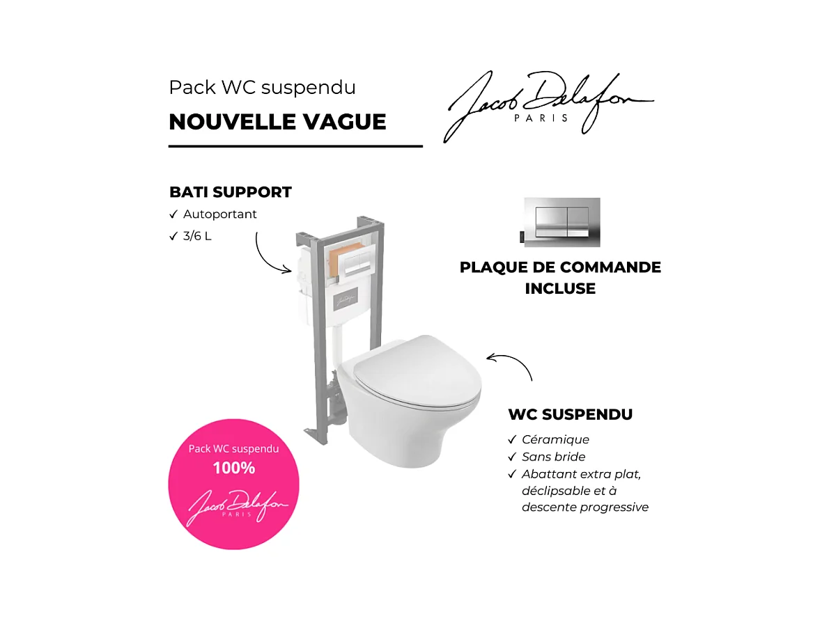 Pack WC suspendu sans bride JACOB DELAFON Nouvelle vague + bati support + plaque chromé
