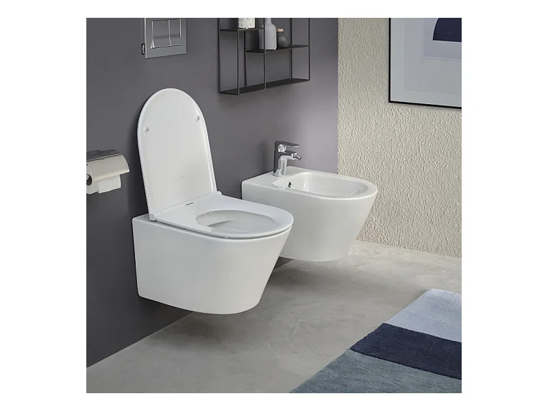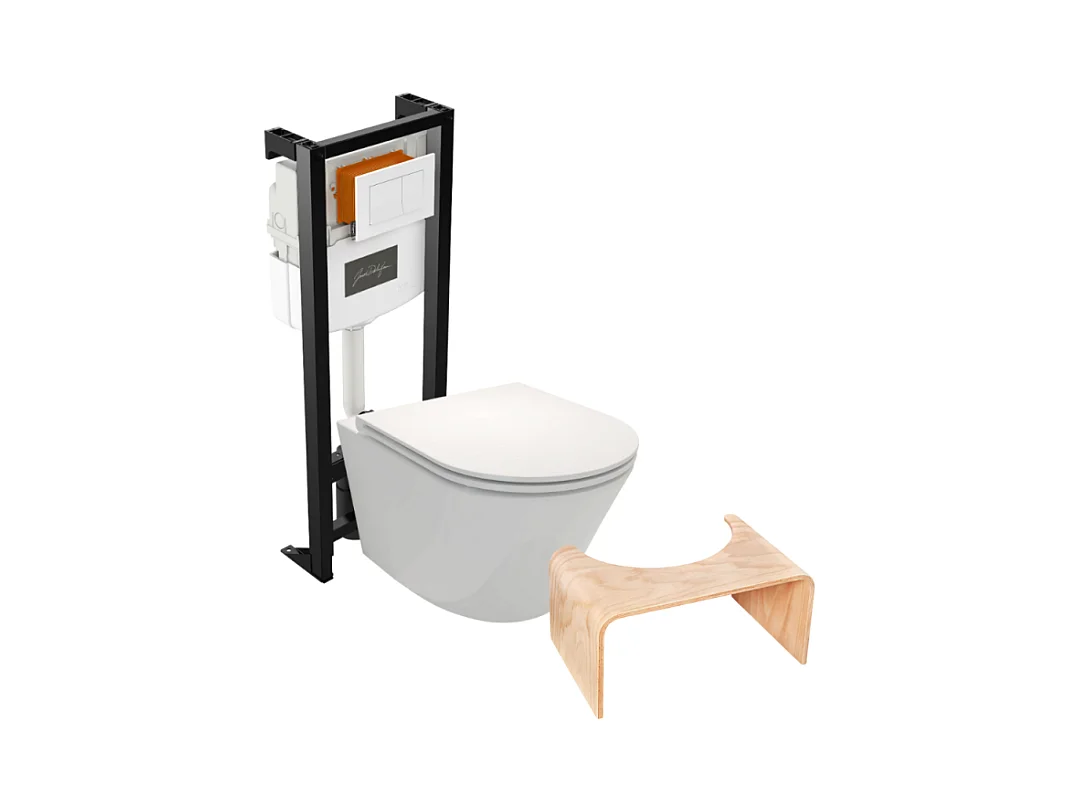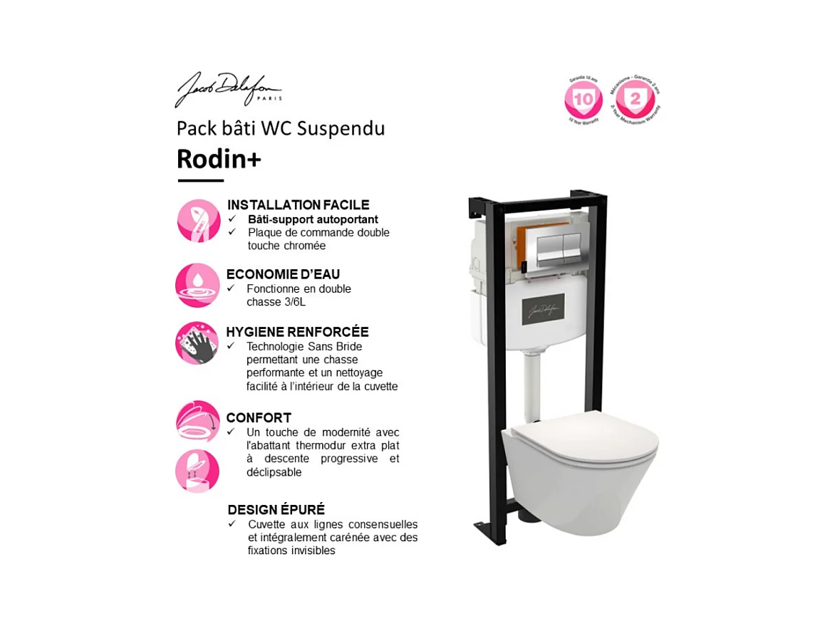 Pack WC suspendu sans bride JACOB DELAFON Rodin+ avec abattant + bâti support + plaque blanche + tabouret bois