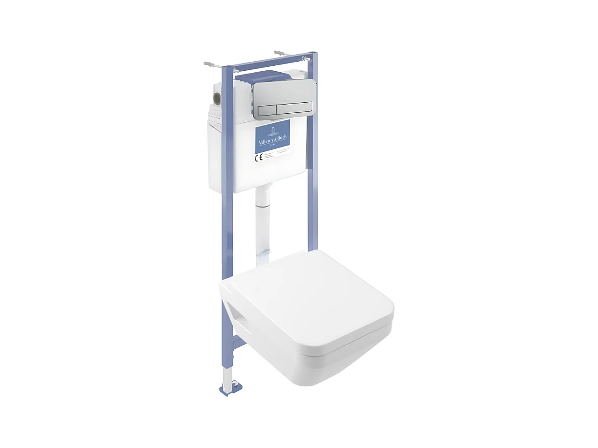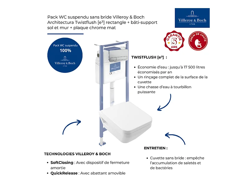 Pack WC suspendu sans bride Villeroy & Boch Architectura Twistflush [e³] rectangle + bâti-support sol et mur + plaque chrome mat