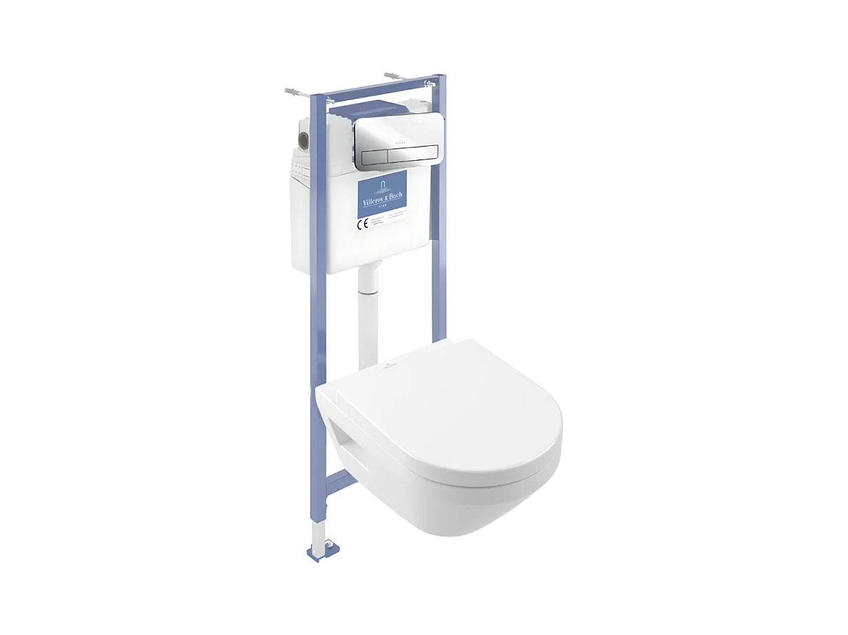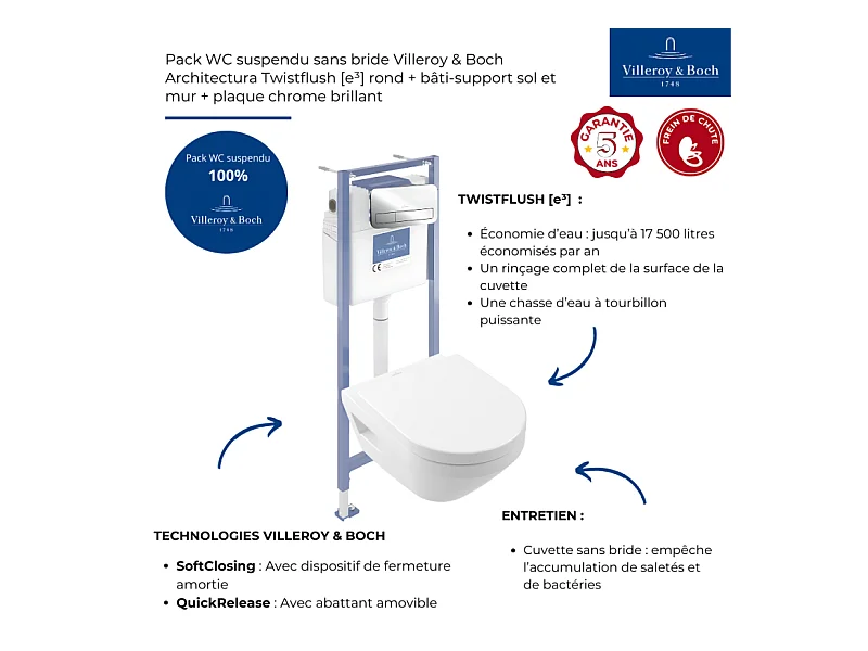Pack WC suspendu sans bride Villeroy & Boch Architectura Twistflush [e³] rond + bâti-support sol et mur + plaque chrome brillant
