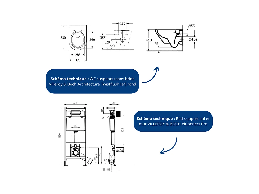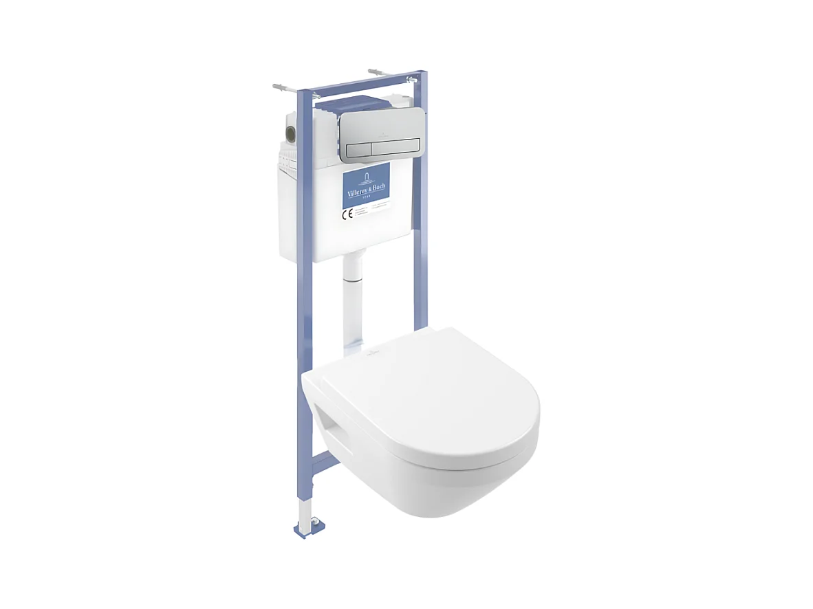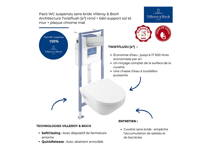 Pack WC suspendu sans bride Villeroy & Boch Architectura Twistflush [e³] rond + bâti-support sol et mur + plaque chrome mat