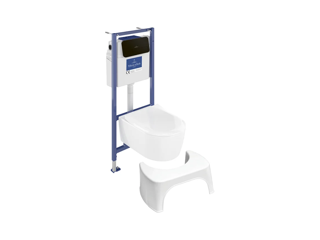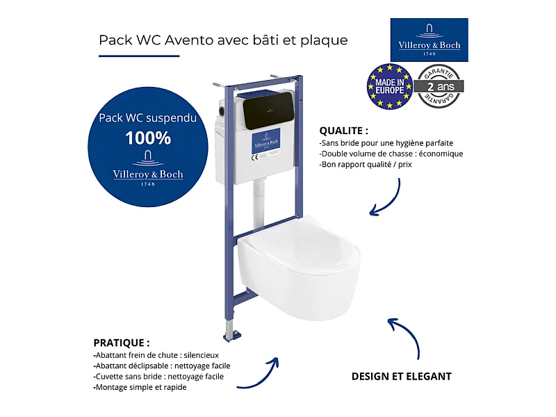 Pack WC sans bride VILLEROY ET BOCH Avento + Bâti support + abattant frein de chute + plaque noir mat + Tabouret blanc