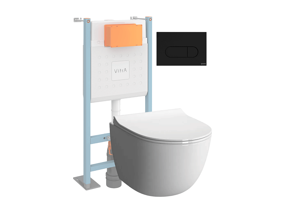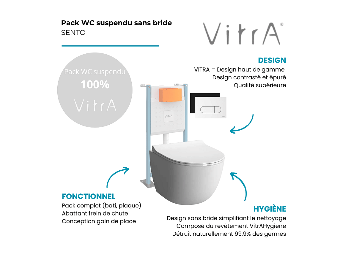 Pack WC suspendu VITRA Sento blanc + bâti autoportant V-Fix Core + Plaque Round Noir mat