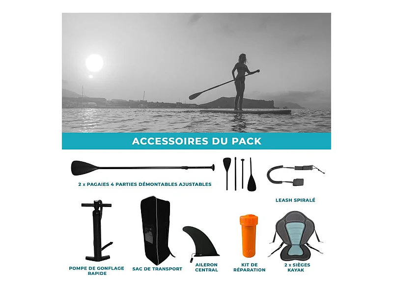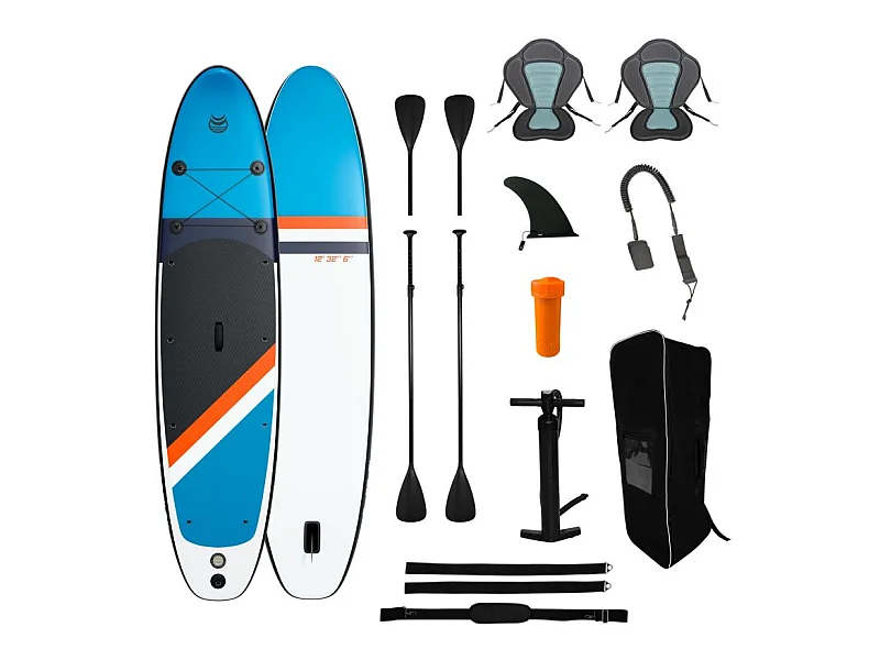 Paddle Gonflable 2 personnes TWO 12' 32'' 6'' (366x81x15cm) avec Pompe, 2 Pagaies, 2 sièges de kayak, Leash et Sac de Transport