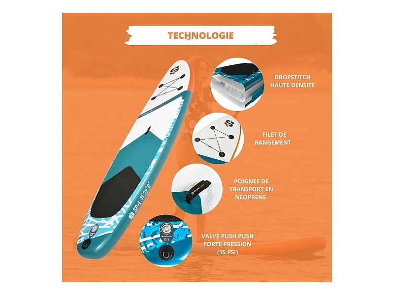 Paddle Gonflable L 11' 32'' 6'' (335 x 81 x 15 cm) avec Pagaie, Leash, Pompe et Sac de Transport