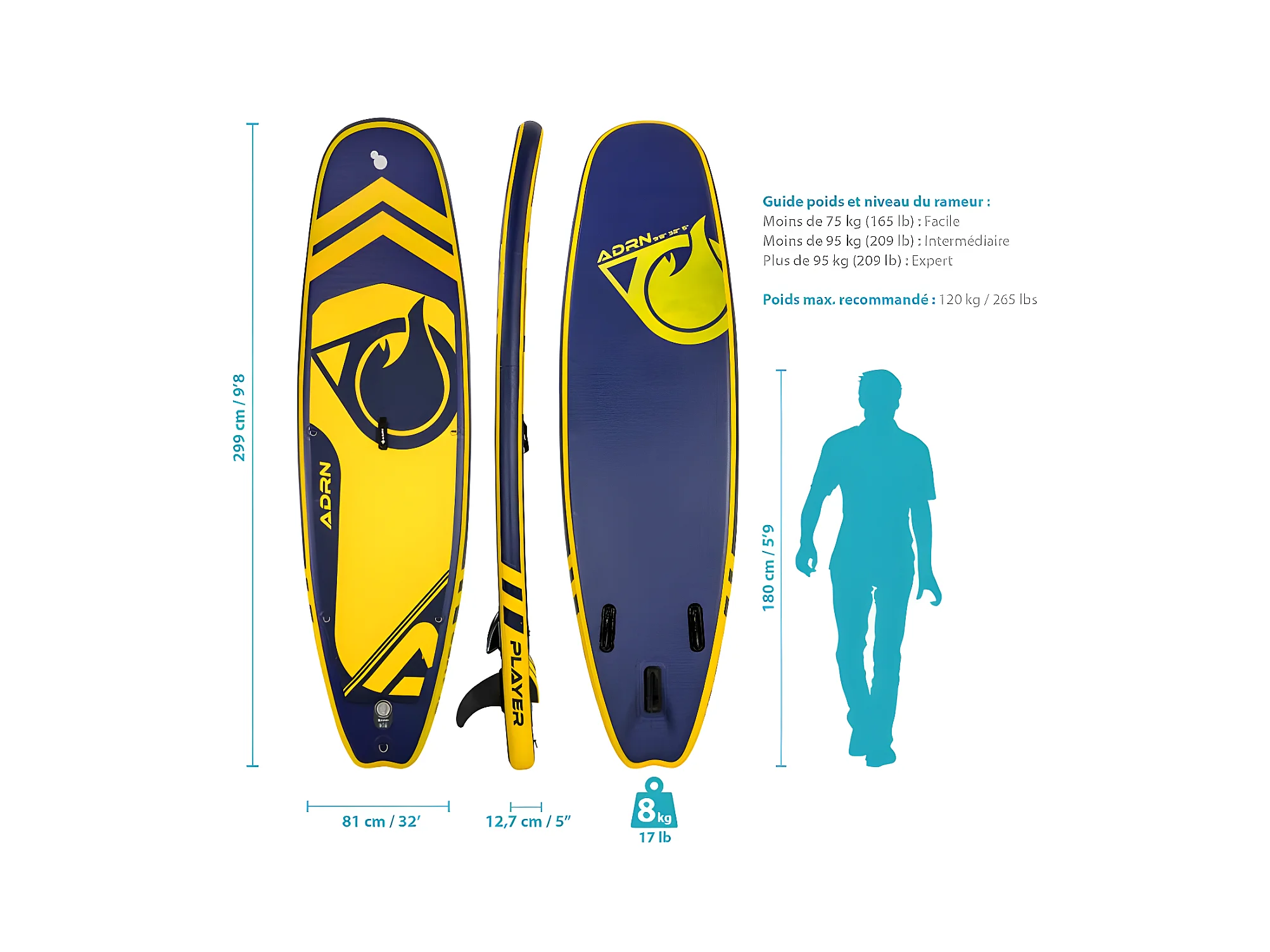 Paddle Gonflable PLAYER 9'8 32'' 5'' (299x81x12,7cm) avec Pompe, Pagaie, Leash et Sac de transport
