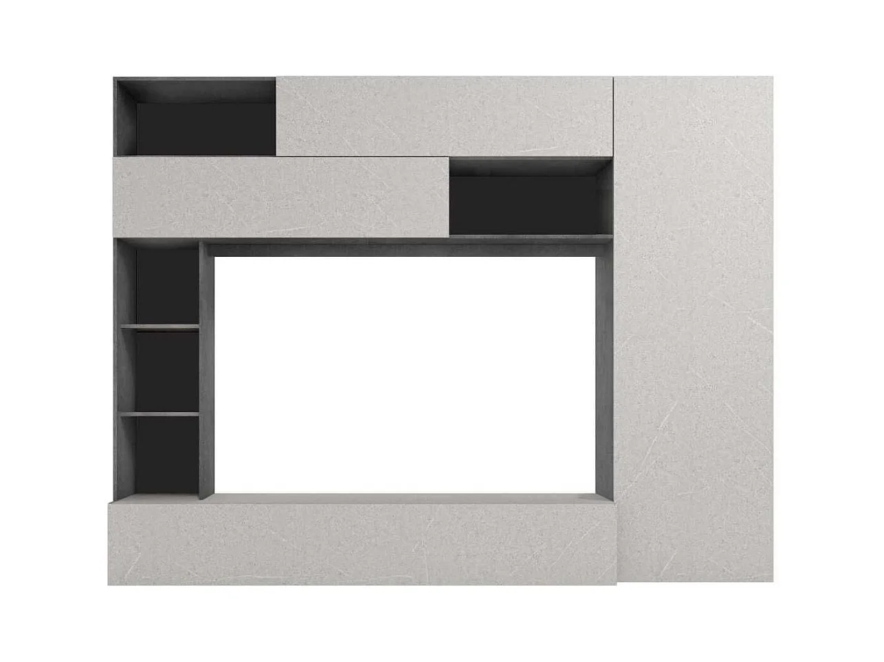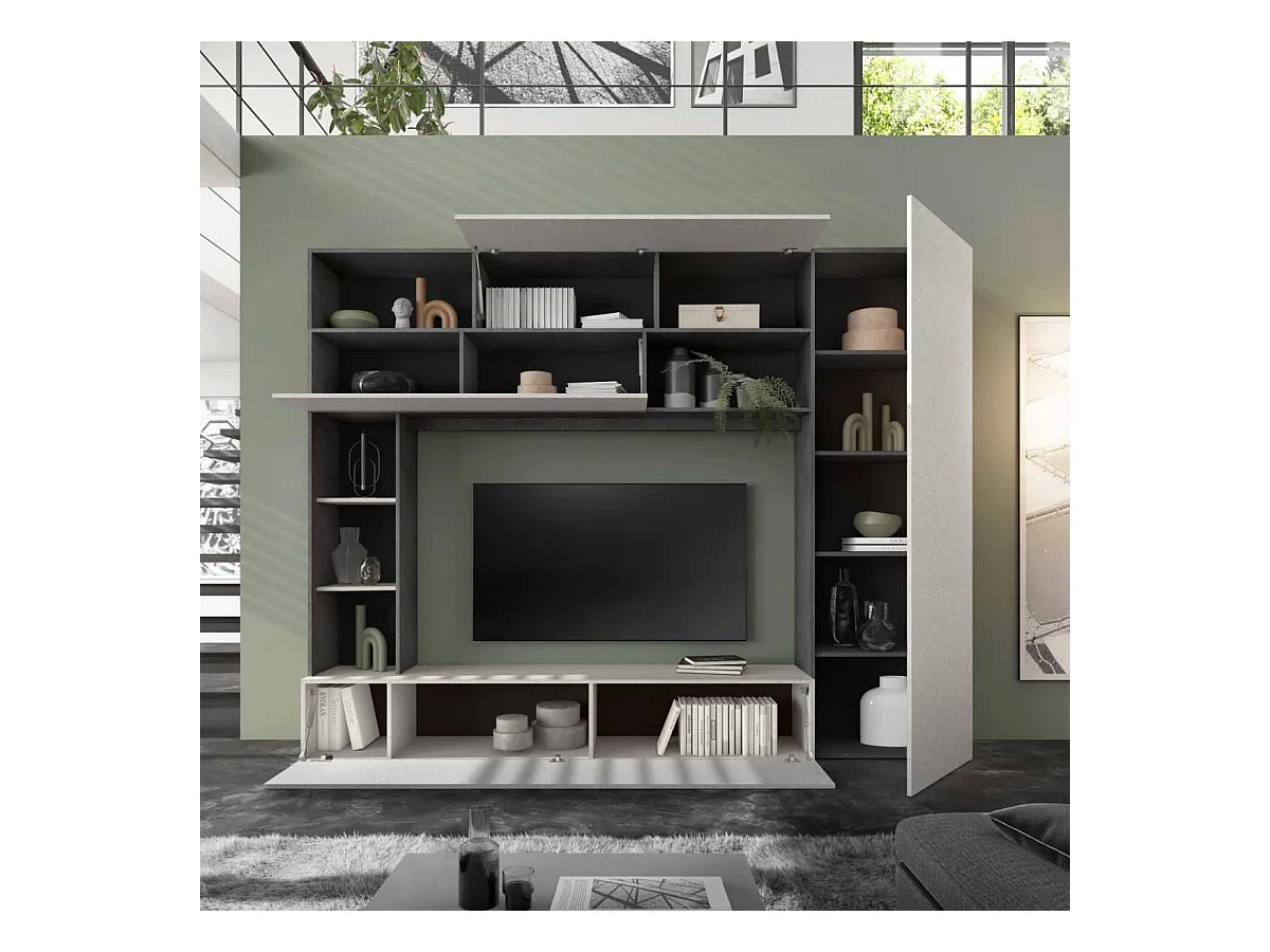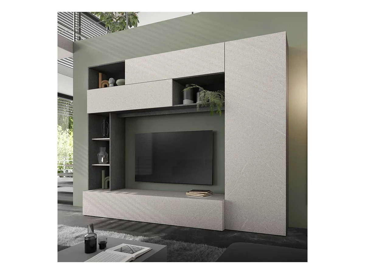 Meuble TV mural avec rangements et étagères aspect pierre grise - PALACIO
