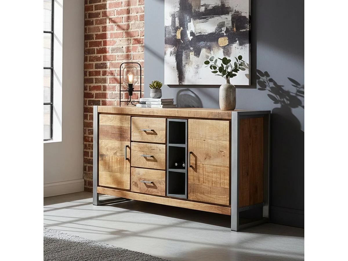 PALISSA - Buffet 2 Portes 3 Tiroirs Bois et Acier Patiné